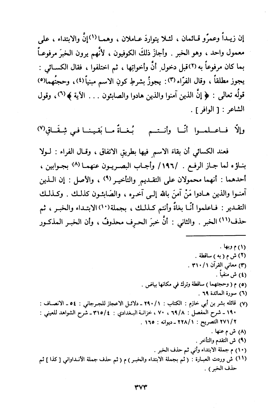 فعند الكسائي أن بقاء الاسم فيها بطريق الاتفاق، وقال الفراء: لولا بناؤه لما جاز الرفع. / 196 / وأجاب البصريون عنهما بجوابين، أحدهما: أنهما محمولان على التقديم والتأخير، والأصل: إن الذين آمنوا والذين هادوا من آمن بالله إلى آخره، والصابئون كذلك. وكذلك التقدير: فاعلموا أنا بغاة وأنتم كذلك، بجملة الابتداء والخبر، ثم حذف الخبر. والثاني: أن خبر الحرف محذوف، وأن الخبر المذكور