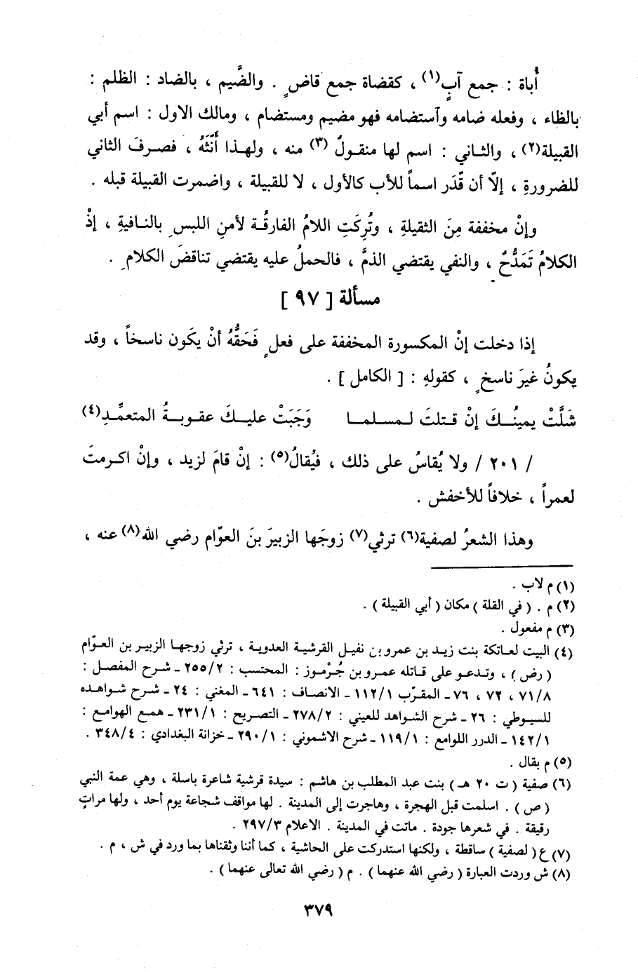 أباة: جمع أب، كقضاة جمع قاض. والضيم، بالضاد: الظلم: بالظاء، وفعله ضامه واستضامه فهو مضيم ومستضام، ومالك الاول: اسم أبي القبيلة، والثاني: اسم لها منقول منه، ولهذا أنئه، فصرف الثاني للضرورة، إلا أن قدر اسما للأب كالأول، لا للقبيلة، واضمرت القبيلة قبله.