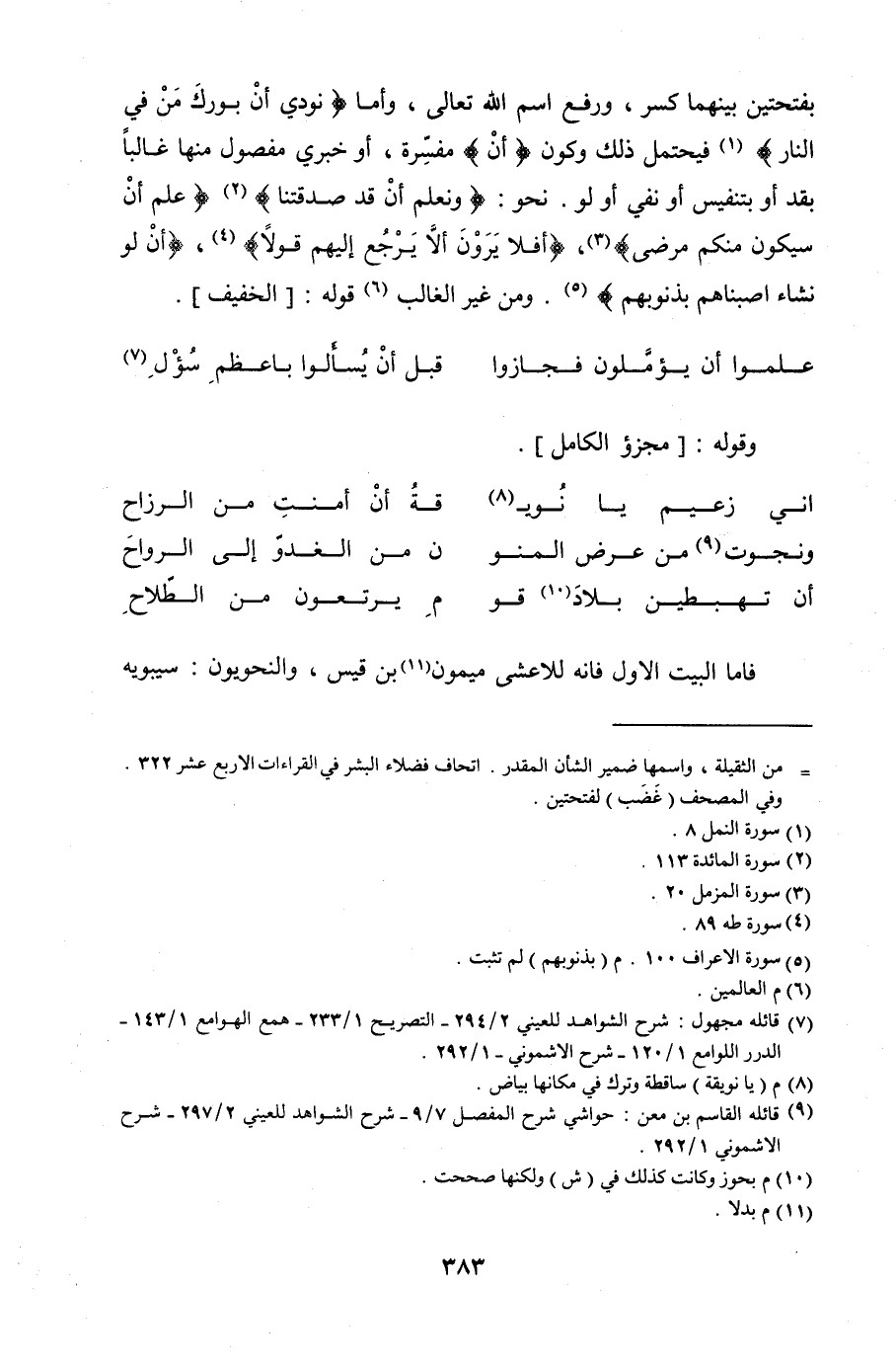 {عَلِمَ أَن سَيَكُونُ مِنكُم مَّرْضَى}، {أَفَلَا يَرَوْنَ أَلَّا يَرْجع إلَيْهمْ قَوْلًا}، {أَنْ لَوْ نَشَاءُ أَصَبْنَاهُمْ بِذُنُوبِهِمْ}. ومن غير الغالب قوله: (الخفيف).