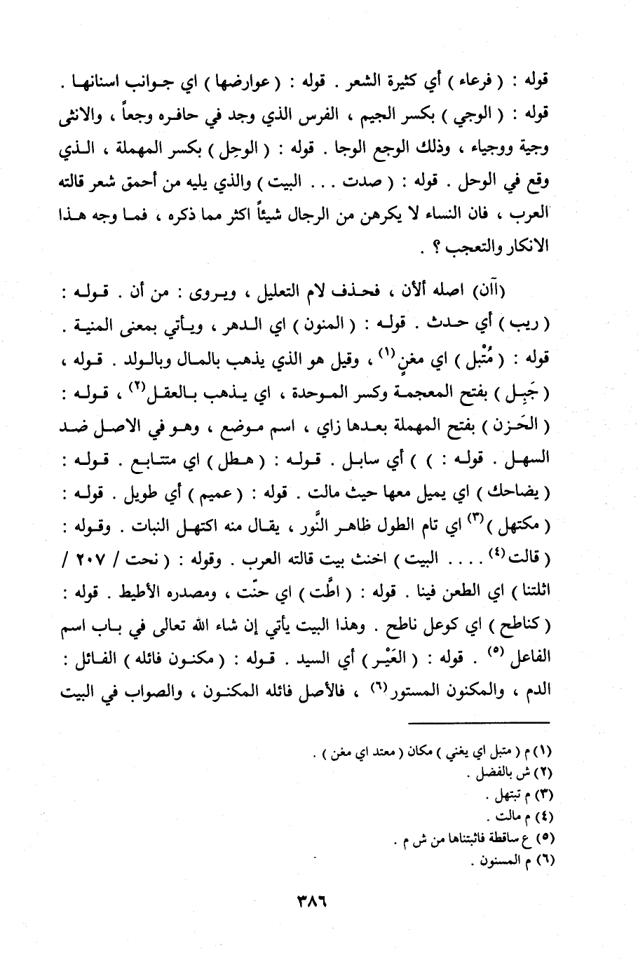 (آان) اصله الأن، فحذف لام التعليل، ويروى: من أن. قوله: (ريب) أي حدث. قوله: (المنون) أي الدهر، ويأتي بمعنى المنية. قوله: (متبل) أي مغن، وقيل هو الذي يذهب بالمال وبالولد. قوله، (جبل) بفتح المعجمة وكسر الموحدة، أي يذهب بالعقل، قوله: (الحزن) بفتح المهملة بعدها زاي، اسم موضع، وهو في الاصل ضد السهل. قوله: أي سابل. قوله: (هطل) أي متتابع. قوله: (يضاحك) أي يميل معها حيث مالت. قوله: (عميم) أي طويل. قوله: (مكتهل) أي تام الطول ظاهر النور، يقال منه اكتهل النبات. وقوله: (قالت ... البيت) اخنث بيت قالته العرب. وقوله: (نحت/ 207 / اثلتنا) اي الطعن فينا. قوله: (اطت) اي حنت، ومصدره الأطيط. قوله: (كناطح) اي كوعل ناطح. وهذا البيت يأتي إن شاء الله تعالى في باب اسم الفاعل. قوله: (العير) أي السيد. قوله: (مكنون فائله) الفائل: الدم، والمكنون المستور، فالأصل فائله المكنون، والصواب في البيت