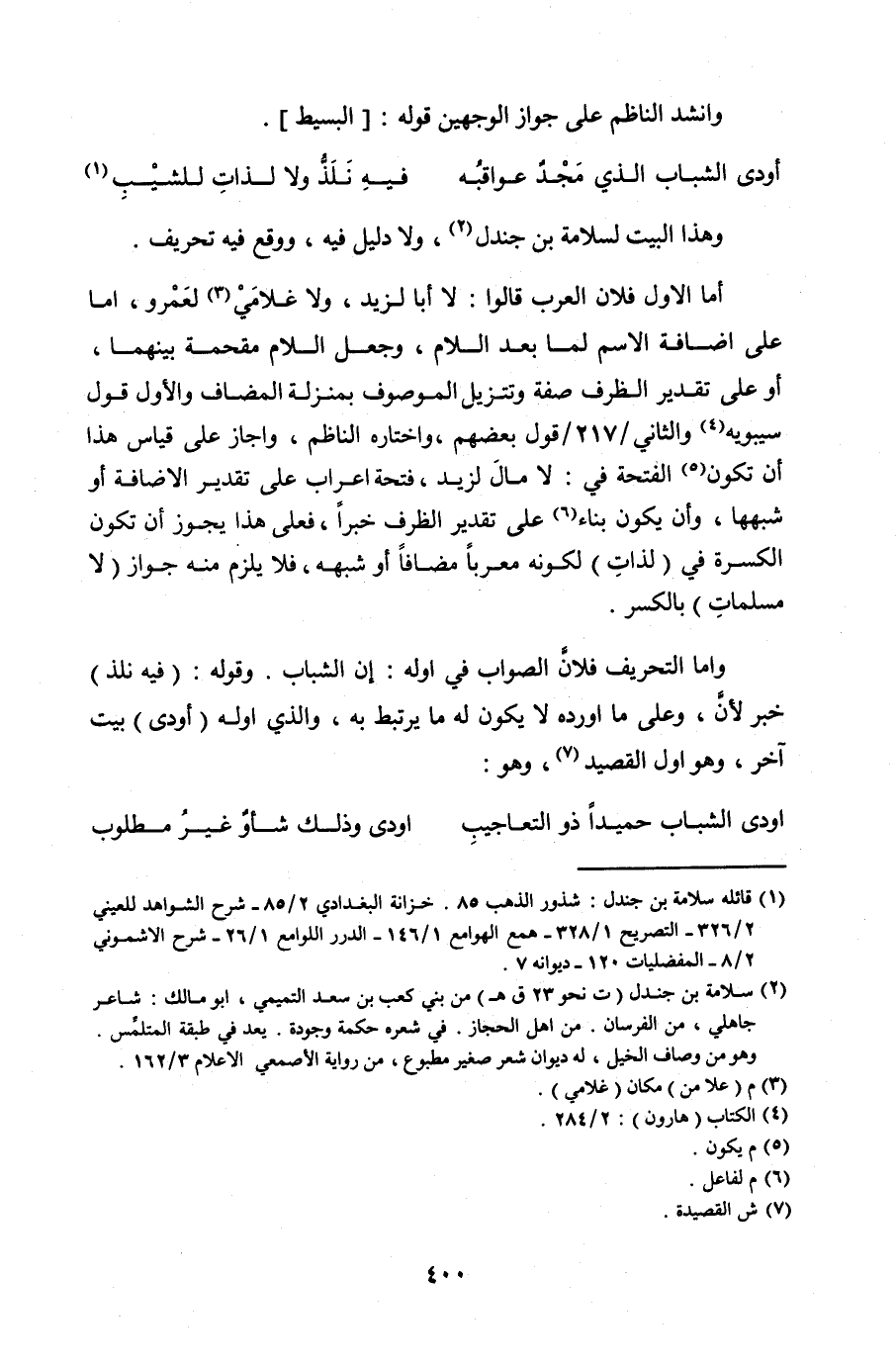 وإما التحريف فلانً الصواب في أوله: إن الشباب. وقوله: (فيه نلذ) خبر لأنَّ, وعلى ما أورده لا يكون له ما يرتبط به, والذي أوله (أودى) بيت آخر, وهو أول القصيد, وهو: