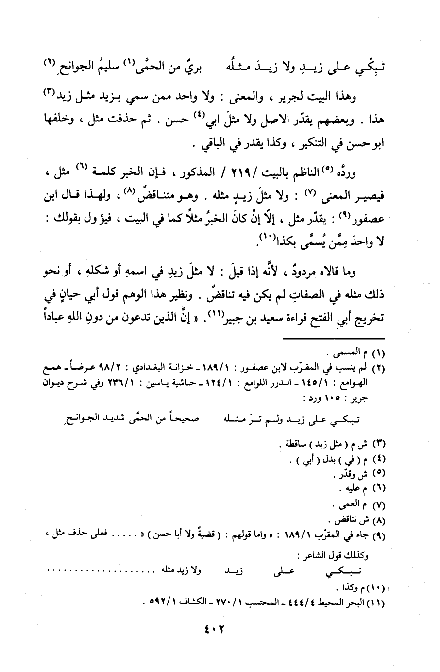 وما قالاه مردودٌ, لأنه إذا قيلَ: لا مثلَ زيدِ في اسمهِ أو شكلهِ, أو نحو ذلك مثله في الصفاتِ لم يكن فيه تناقضً. ونظير هذا الوهم قول أبي حيانٍ في تخريج أبي الفتح قراءة سعيد بن جبير. {إِنَّ الَّذِينَ تَدْعُونَ مِن دُونِ اللَّهِ عِبَاداً