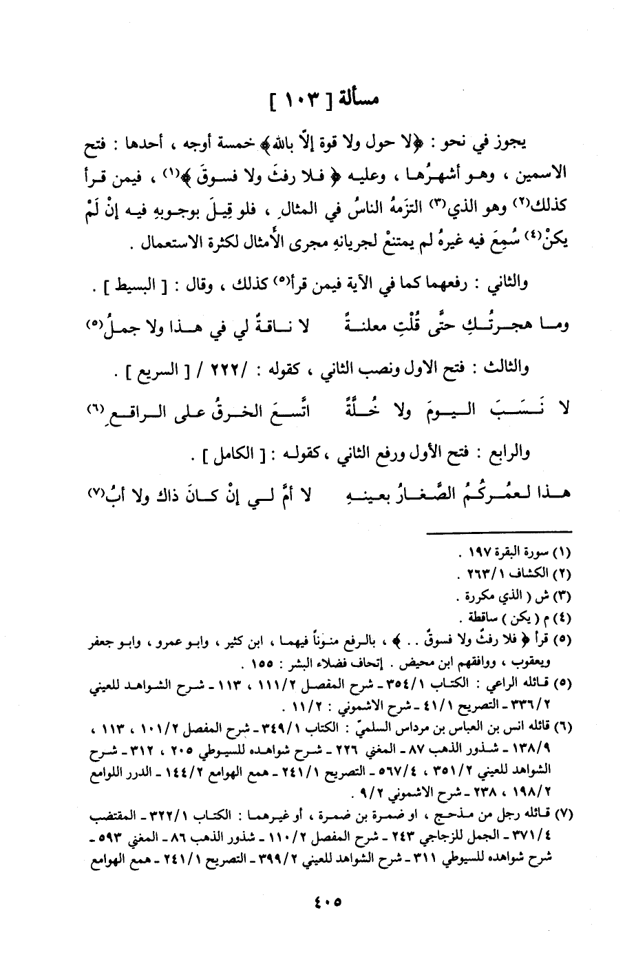 يجوز في نحو: (لا حول ولا قوة إلّا بالله) خمسة أوجه, أحدها: فتح الاسمين, وهو أشهرُها, وعليه {فَلا رَفَثَ وَلا فُسُوقَ} [البقرة:197] , فمن قرأ كذلك وهو الذي التزَمهُ الناسُ في المثالِ, فلو قِيلَ بوجوبه فيه إنْ لَمْ يكنْ سُمِعَ فيه غيرهُ لم يمتنعْ لجريانِه مجرى الأمثال لكثرة الاستعمال.