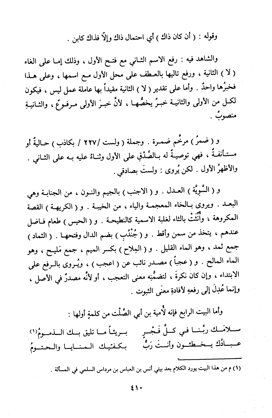 والشاهد فه: رفع الاسم الثاني مع فتح الأول, وذلك إما على إلغاء (لا) الثانية, ورفع تاليها بالعطف على محل الأول مع اسمها, وعلى هذا فخبرُها واحدٌ. وأما على تقدير (لا) الثانية مقيداً بها عاملة عمل ليس, فيكون لكل من الأولى والثانية خبرٌ يخصُّها, لأنَّ خبرَ الأولى مرفوعٌ, والثانيةِ منصوبً.