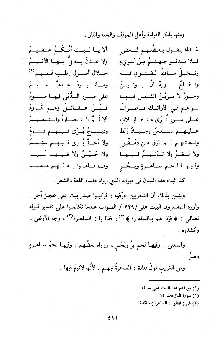 ويتبين بذلك أن النحويين حرّفوه, فركبوا صدر بيت على عجز آخر. وأورد المفسرون البيت على /229/ الصواب عندما تكلموا على تفسير قوله تعالى {فَإِذَا هُمْ بِالسَّاهِرَةِ} [النازعات:14] , فقالوا: الساهرة, وجه الأرض, وأنشدوا.