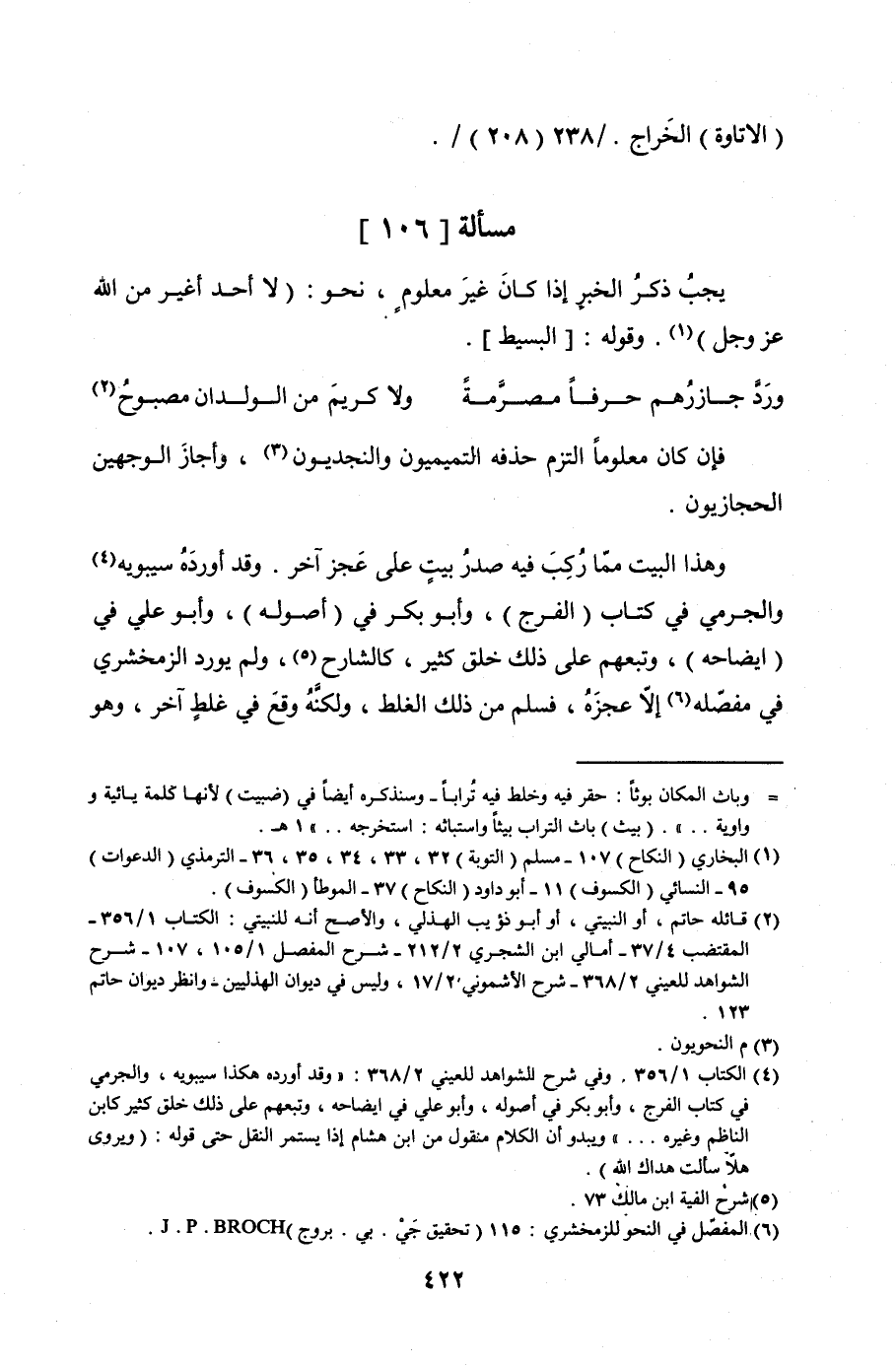 وهذا البيت ممّا رُكِبَ فيه صدرُ بيتٍ على عَجز آخر. وقد أوردَهُ سيبوية والجرمي في كتاب (الفرج) , وأبو بكر في (أصوله) , وأبو علي في (إيضاحه) , وتبعهم على ذلك خلق كثير, كالشارح, ولم يورد الزمخشري في مفصّله إلا عجزَهُ, فسلم من ذلك الغلط, ولكنَّهُ وقعَ في غبطٍ آخر, وهو