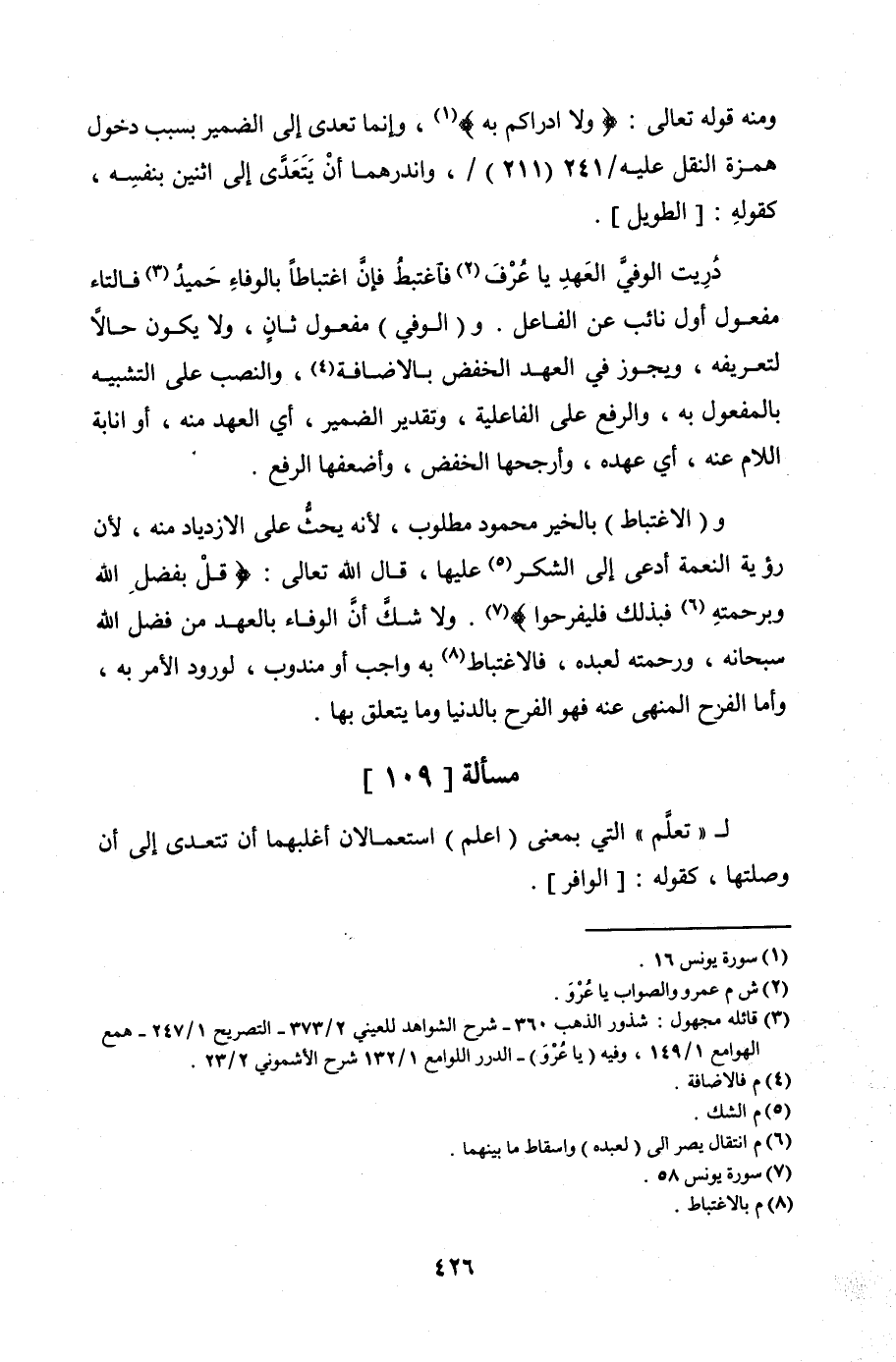 دُرِيت الوفيَّ العهد يا عُرْفَ فاغتبطُ فإنَّ اغتباطاً بالوفاءِ حَميدُ فالتاء مفعول أول نائب عن الفاعل. و (الوفي) مفعول ثانٍ, ولا يكون حالاً لتعريفه, ويجوز في العهد الخفض بالإضافة, والنصب على التشبيه بالمفعول به, والرفع على الفاعلية, وتقدير الضمير, أي العهد منه, أو إنابة اللام عنه, أي عهده, وأرجحها الخفض, وأضعفها الرفع.