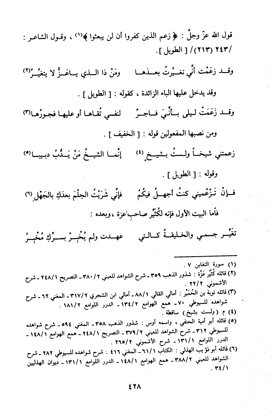 قول الله عزّ وجلَّ: {زَعَمَ الَّذِينَ كَفَرُوا أَنْ لَنْ يُبْعَثُوا} [التغابن:8] , وقول الشاعر: /343 (213) / [الطويل].