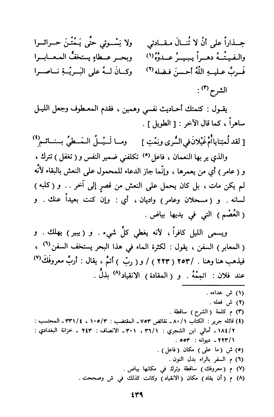 والذي يربها النعمان, فاعل تكلفني ضمير النفس و (تغفل) تترك, و (عامر) أي من يعمرها, وإنّما جاز الدعاء للمحمول على النعش بالبقاء لأنَّه لم يكن مات, بل كان يحمل على النعش من قصرٍ إلى آخر .. و (كلبه) لسانه. و (مسحلان وعامر) واديان, أي: وإن كنت بعيداً عنك. و (العُصْم) التي في يديها بياض.