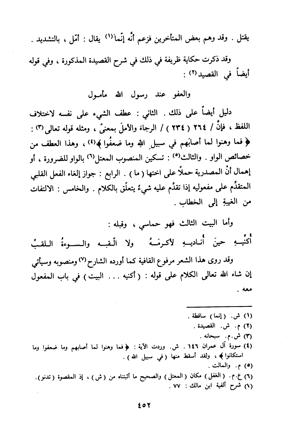 دليل أيضاً على ذلك. الثاني: عطف الشيء على نفسه لاختلاف اللفظ. فإنَّ /264 (234) / الرجاءَ والأملَ بمعنىً, ومثله قوله تعالى: {فَمَا وَهَنُوا لِمَا أَصَابَهُمْ فِي سَبِيلِ اللَّهِ وَمَا ضَعُفُوا} [آل عمران:146] , وهذا العطف من خصائص الواو. والثالث: تسكين المنصوب المعتل بالواو للضرورة, أو إهمال أنْ المصدرية حملاً على أختها (ما). الرابع: جواز إلغاء الفعل القلبي المتقدِّم على مفعولية إذا تقدَّم عليه شيءٌ يتعلّق بالكلام. والخامس: الالتفات من الغيبة إلى الخطاب.
