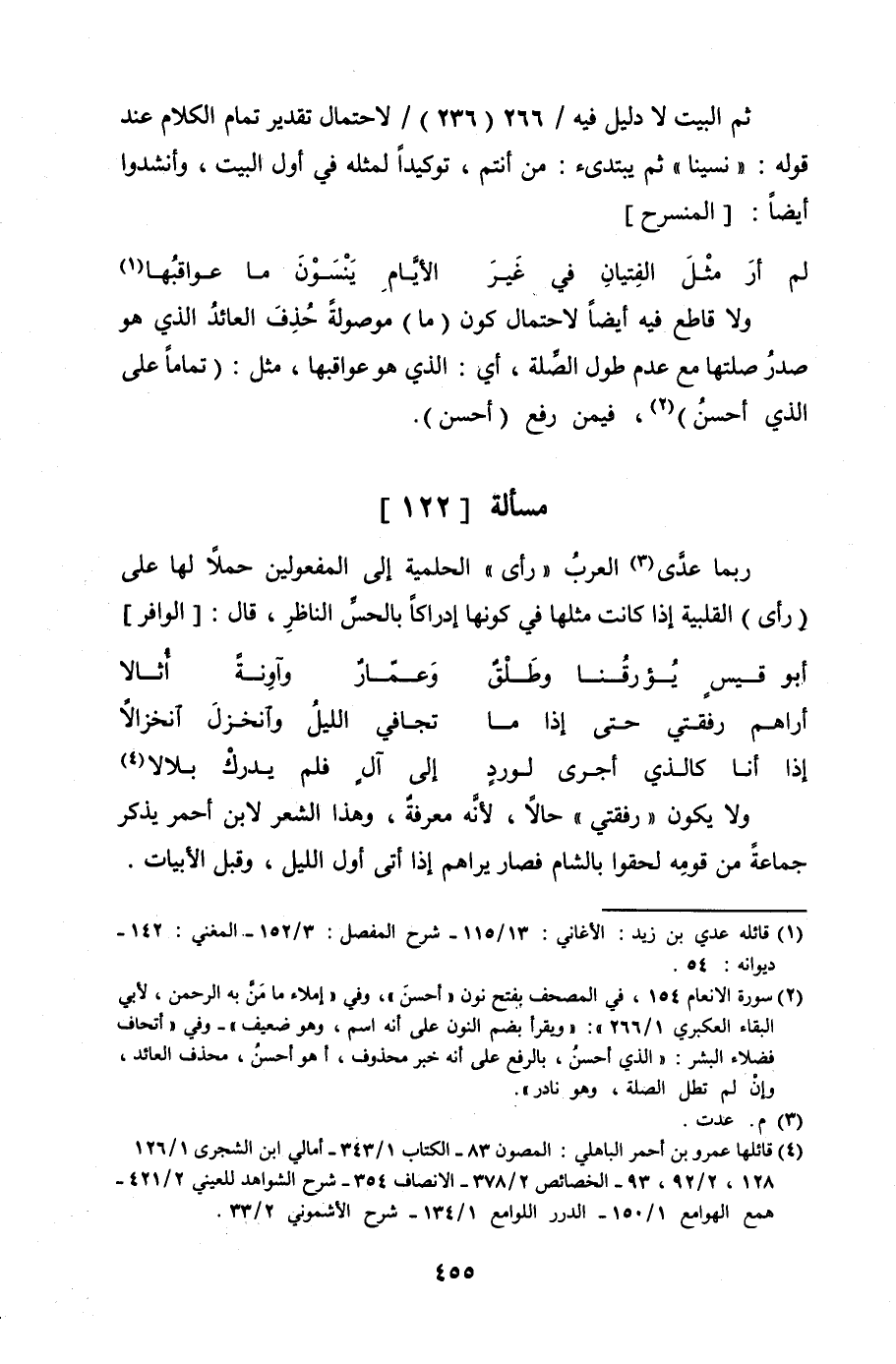 ثم البيت لا دليل فيه /266 (236) / لاحتمال تقدير تمام الكلام عند قوله: «نسينا» ثم يبتدئ: من أنتم, توكيداً لمثله في أول البيت, وأنشدوا أيضاً: [المنسرح]