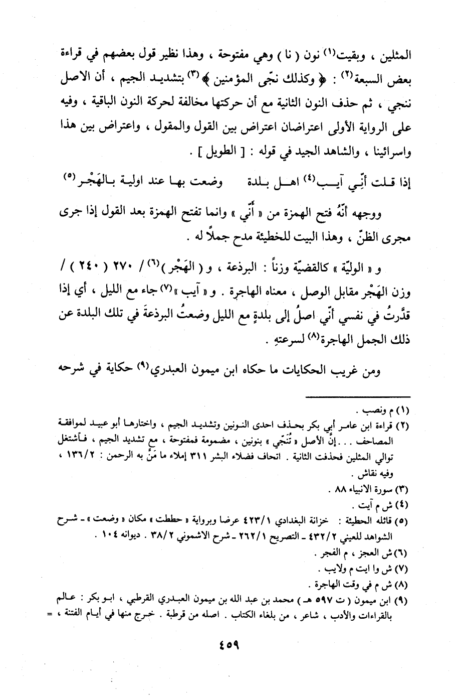 المثلين, وبقيت نون (نا) وهي مفتوحة, وهذا نظير قول بعضهم في قراءة بعض السبعة: {وَكَذَلِكَ نجّي الْمُؤْمِنِينَ} [الأنبياء:88] بتشديد الجيم, أن الأصل ننجي, ثم حذف النون الثانية مع أن حركتها مخالفة لحركة النون الباقية, وفيه على الرواية الأولى اعتراضان اعتراض بين القول والمقول, واعتراض بين هذا واسرائينا, والشاهد الجيد في قوله: [الطويل].