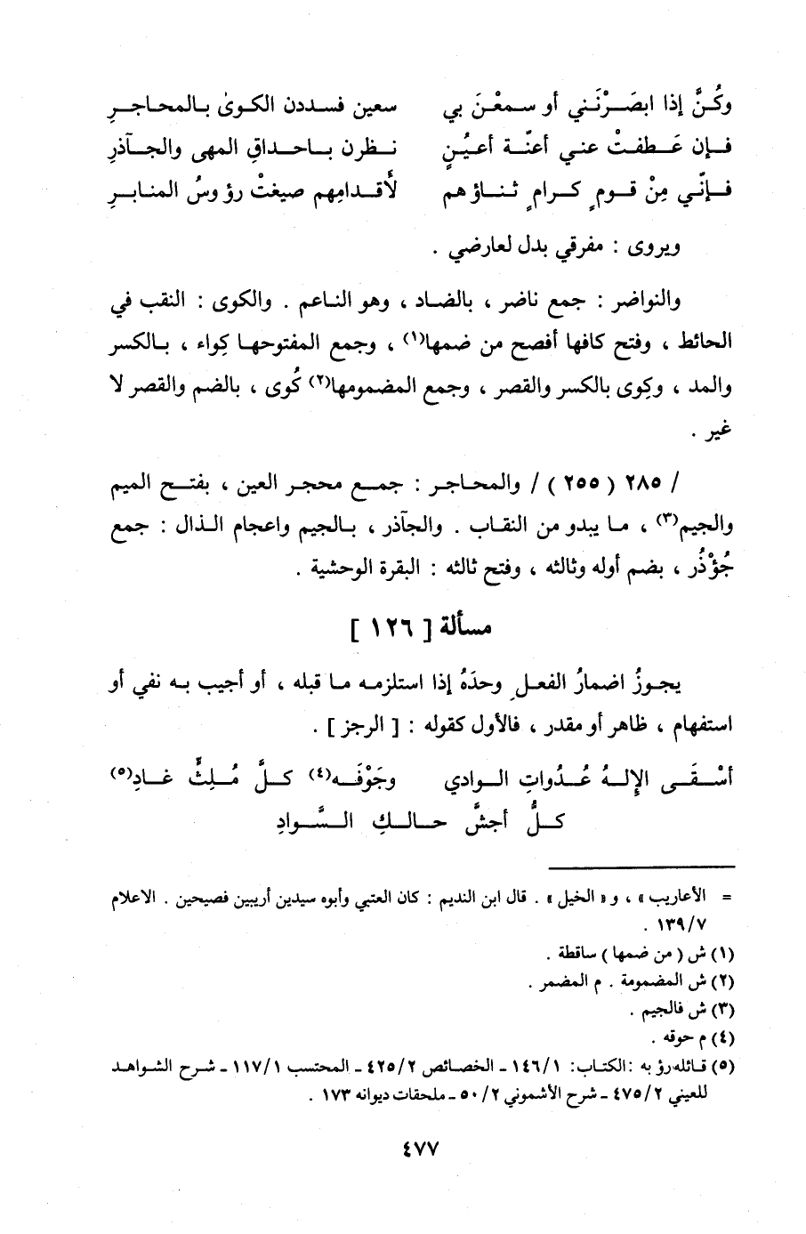 /285 (255) / والمحاجر: جمع محجر العين، بفتح الميم والجيم، ما يبدو من النقاب. والجآذر، بالجيم واعجام الذال: جمع جُؤْذُر، بضم أوله وثالثه، وفتح ثالثه: البقرة الوحشية.