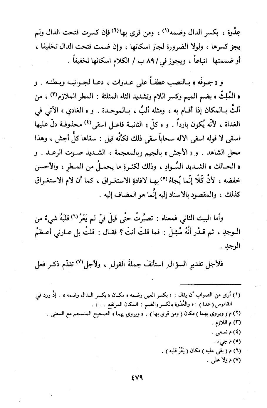 و «جوفَة» بالنصب عطفًا على عدوات، دعا لجوانبه وبطنه. و «المُلِثّ» بضم الميم وكسر اللام وتشديد الثاء المثلثة: المطر الملازم، من ألثَّ بالمكان إذا اقام به، ومثله ألبَّ، بالموحدة. و «الغادي» الآتي في الغداة، لأنّه يُكون باردًا. و «كلّ» الثانية فاعل اسقى محذوفة دلّ عليها اسقى لا قوله اسقى الاله سحابًا سقى ذلك فكأنَّه قيل: سقاها كلُّ أجش، وهذا محل الشاهد. و «الأجش» بالجيم وبالمعجمة، الشديد صوت الرعد. و «الحالك» الشديد السَّوادِ، وذلك لكثرةِ ما يحملُ من المطرِ، والأحسن خفضه، لأنَّ كّلاً إنّما يُجاءُ بها لا فادةِ الاستغراق، كما أن لام الاستغراق كذلك، والمقصود بالاسناد إليه إنَّما هو المضاف إليه.