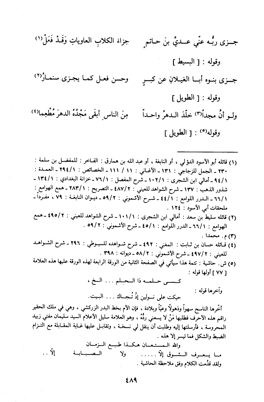 (جزى ربُّه عنّي عديَّ بنَ حاتمٍ ... جزاءَ الكلابِ العاوياتِ وَقَدْ فَعَلْ)