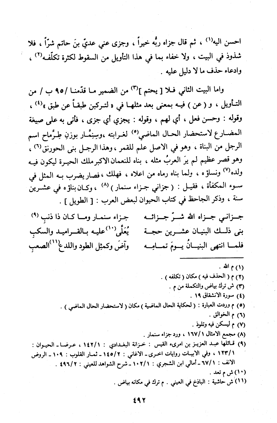 واما البيت الثاني فلا [يحتم] من الضمير ما قدّمنا /95 ب/ من التأويل، و (عن) فيه بمعنى بعد مثلها في «لتركبن طبقًا عن طبق»، وقوله: وحسن فعل، أي لهم، وقوله: يجزي أي جزى، فأتى به على صيغة المضارع لاستحضار الحال الماضي لغرابته، وسِنِمَّار بوزنِ طِرَّماح اسم الرجل من البناة، وهو في الأصل علم للقمر، وهذا الرجل بنى الحورنق، وهو قصر عظيم لم يرَ العربُ مثله، بناه للنعمان الأكبر ملك الحيرة ليكون فيه ولده ونساؤه، ولما بناه رماه من أعلاه، فهلك، فصار يضرب به المثل في سوء المكفأة، فقيل: (جزاني جزاء سنمار)، وكان بناؤه في عشرين سنة، وذكر الجاحظ في كتاب الحيوان لبعض العرب: [الطويل].