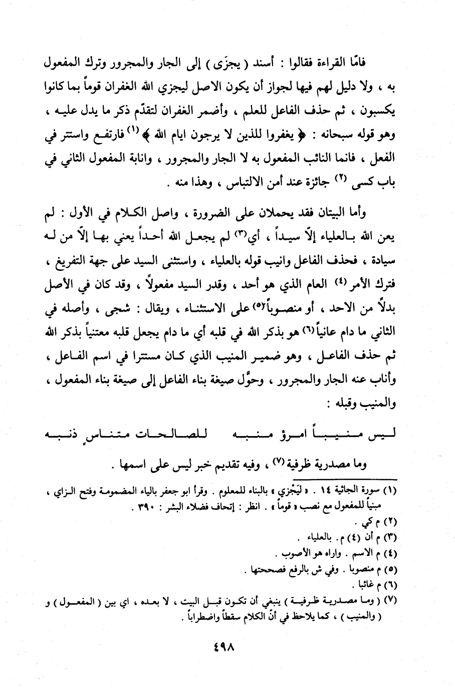 فأما القراءة فقالوا: أسند (يجزَى) إلى الجار والمجرور وترك المفعول به، ولا دليل لهم فيها لجواز أن يكون الأصل ليجزي الله الغفران قومًا بما كانوا يكسبون، ثم حذف الفاعل للعلم، وأضمر الغفران لتقدّم ذكر ما يدل عليه، وهو قوله سبحانه: {يَغْفِرُوا لِلَّذِينَ لا يَرْجُونَ أَيَّامَ اللَّهِ} [الجاثية: 14] فارتفع واستتر في الفعل، فإنما النائب المفعول به لا الجار والمجرور، وانابة المفعول الثاني في باب كسى جائزة عند أمن الالتباس، وهذا منه.