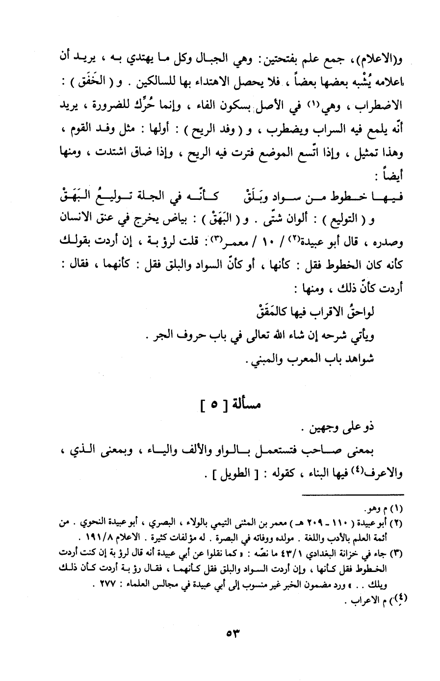 و (التوليع): ألوان شتى. و (البهق): بياض يخرج في عنق الإنسان وصدره، قال أبو عبيدة /10/ معمر: قلت لرؤبة، إن أردت بقولك كأنه كان الخطوط فقل: كأنها، أو كأن السواد والبلق فقل: كأنهما، فقال: أردت كأن ذلك، ومنها: