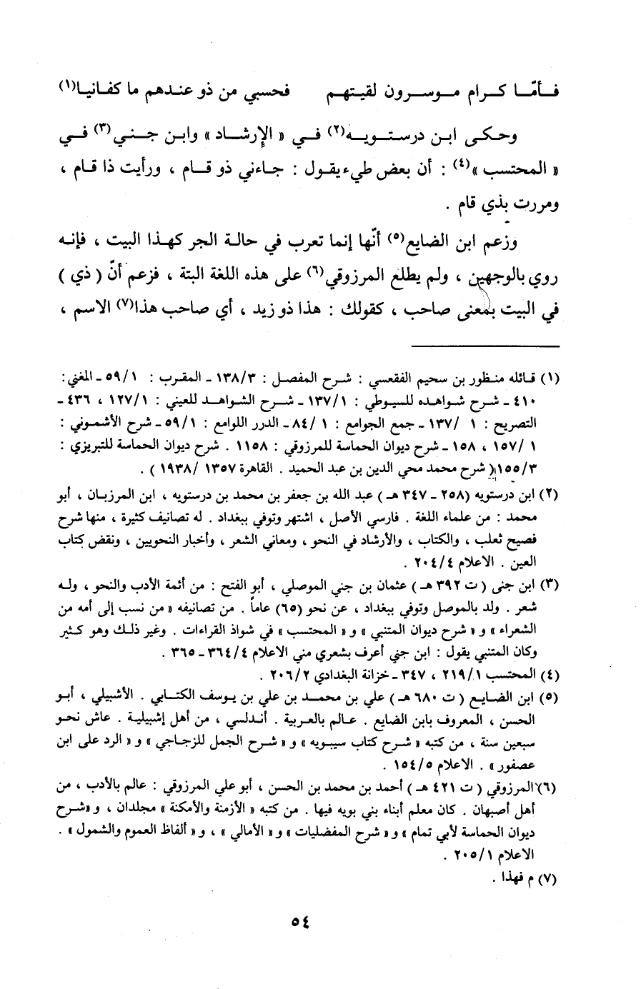 وزعم ابن الضايع أنها إنما تعرب في حالة الجر كهذا البيت، فإنه روي بالوجهين، ولم يطلع المرزوقي على هذه اللغة البتة، فزعم أن (ذي) في البيت بمعنى صاحب، كقوله: هذا ذو زيد، أي صاحب هذا الاسم،