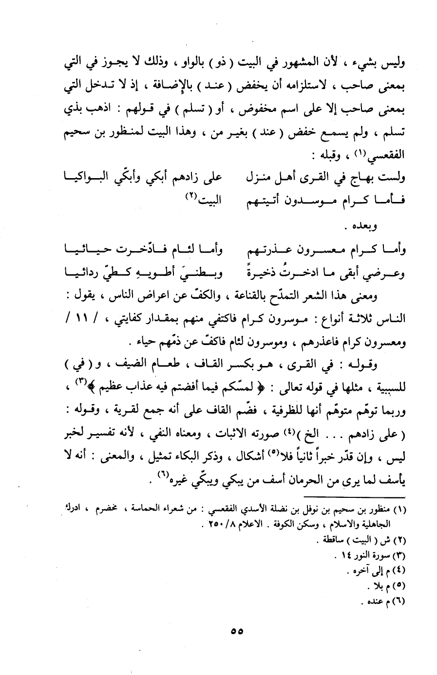 ومعنى هذا الشعر التمدح بالقناعة، والكف عن أعراض الناس، يقول: الناس ثلاثة أنواع: موسرون كرام فاكتفي منهم بمقدار كفايتي، /11/ ومعسرون كرام فاعذرهم، وموسرون لئام فاكف عن ذمهم حياء.