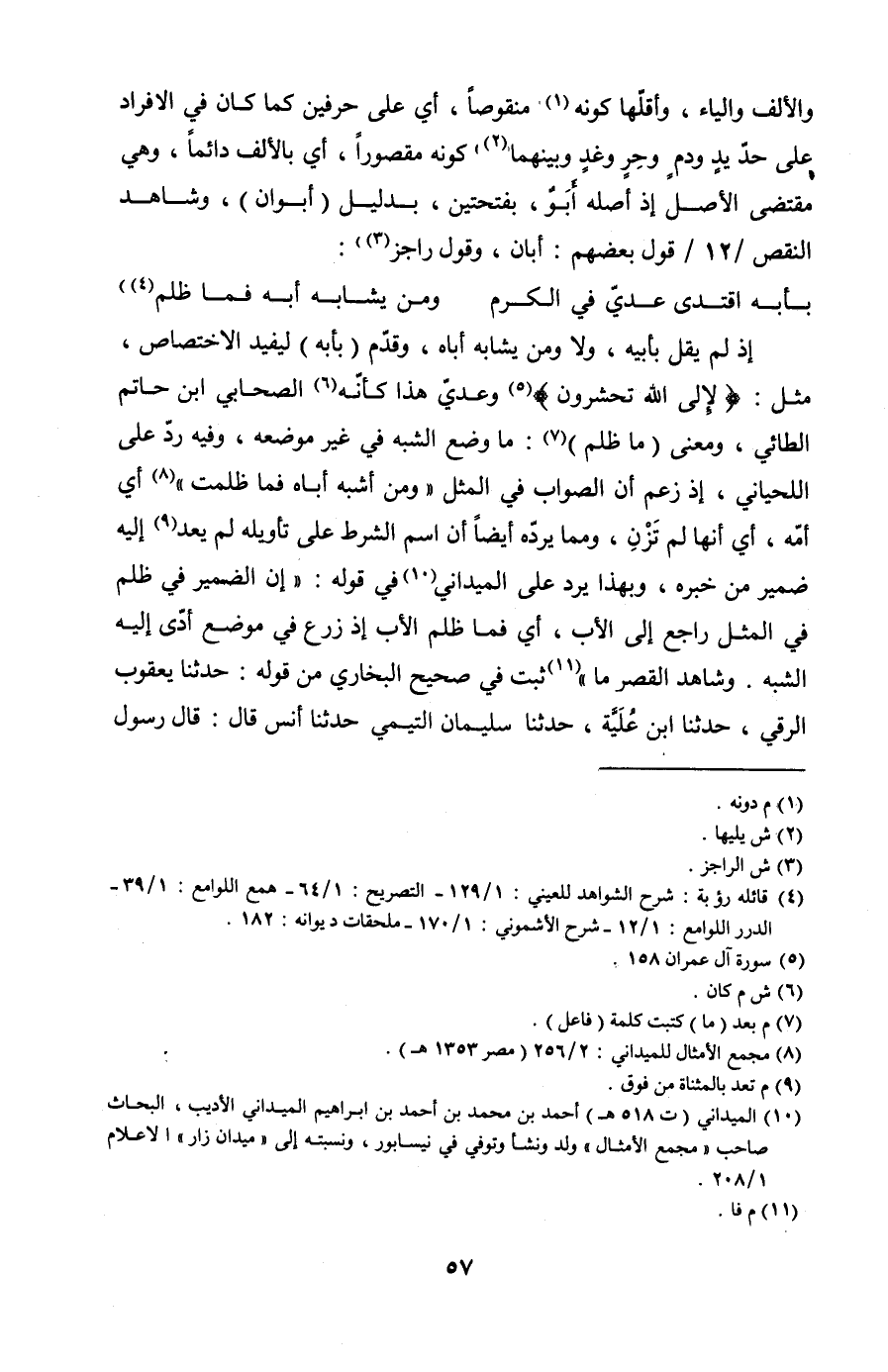 إذ لم يقل بأبيه، ولا ومن يشابه أباه، وقدّم (بأبه) ليفيد الاختصاص، مثل: {لَإِلَى اللَّهِ تُحْشَرُونَ} [سورة آل عمران: 158]، وعديّ هذا كأنه الصحابي ابن حاتم الطائي، ومعنى (ما ظلم): ما وضع الشبه في غير موضعه، وفيه رد على اللحياني؛ إذ زعم أن الصواب في المثل "ومن أشبه أباه فما ظلمت" أي أمه، أي أنها لم تزن، ومما يرده أيضاً أن اسم الشرط على تأويله لم يعد إليه ضمير من خبره، وبهذا يرد على الميداني في قوله: "إن الضمير في ظلم في المثل راجع إلى الأب، أي فما ظلم الأب إذ زرع في موضع أدى إليه الشبه. وشاهد القصر ما" ثبت في صحيح البخاري من قوله: حدثنا يعقوب الرقي، حدثنا ابن عُلية، حدثنا سليمان التيمي حدثنا أنس قال: قال رسول