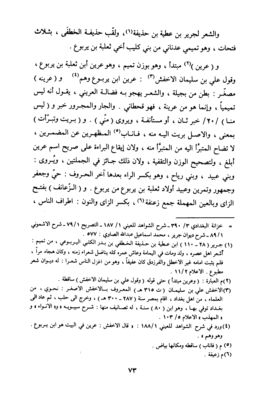 و (عرين) مبتدأ، هو بوزن تميم، وهو عرين ابن ثعلبة بن يربوع، وقول علي بن سليمان الأخفش: عرين ابن يربوع وهم و (عرينه) مصغر: بطن من بجيلة، والشعر يهجو به فضالة العريني، يقول أنه ليس تميماً، وإنما هو من عرينه، فهو قحطاني، والجار والمجرور خبر و (ليس منا) /20/ خبر ثان، أو مستأنفة، ويروي (مني). و (بريت وتبرّأت) بمعنى، والأصل بريت إليه منه، فأناب المظهرين عن المضمرين، لاتضاح المتبرأ إليه من المتبرأ منه؛ ولأن إيقاع البراءة على صريح اسم عرين أبلغ، ولتصحيح الوزن والتقفية؛ ولأن ذلك جائز في الجملتين، ويروي: وبني عبيد، وبني رياح، وهو بكسر الراء بعدها آخر الحروف: حيّ وجعفر وجمهور وتمرين وعبيد أولاد ثعلبة بن يربوع من يربوع، و (الزعانف) بفتح الزاي وبالعين المهملة جمع زعنفة، بكسر الزاي والنون: أطراف الناس،