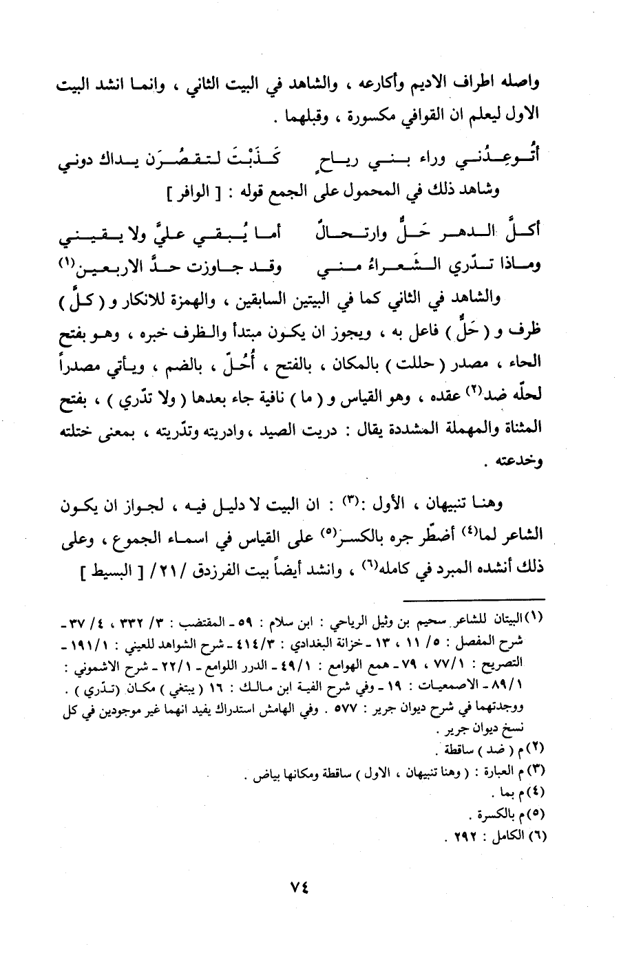 وهنا تنبيهان، الأول: أن البيت لا دليل فيه، لجواز أن يكون الشاعر لما أضطر جره بالكسر على القياس في أسماء الجموع، وعلى ذلك أنشده المبرد في كامله، وانشد أيضاً بيت الفرزدق /21/ [البسيط].
