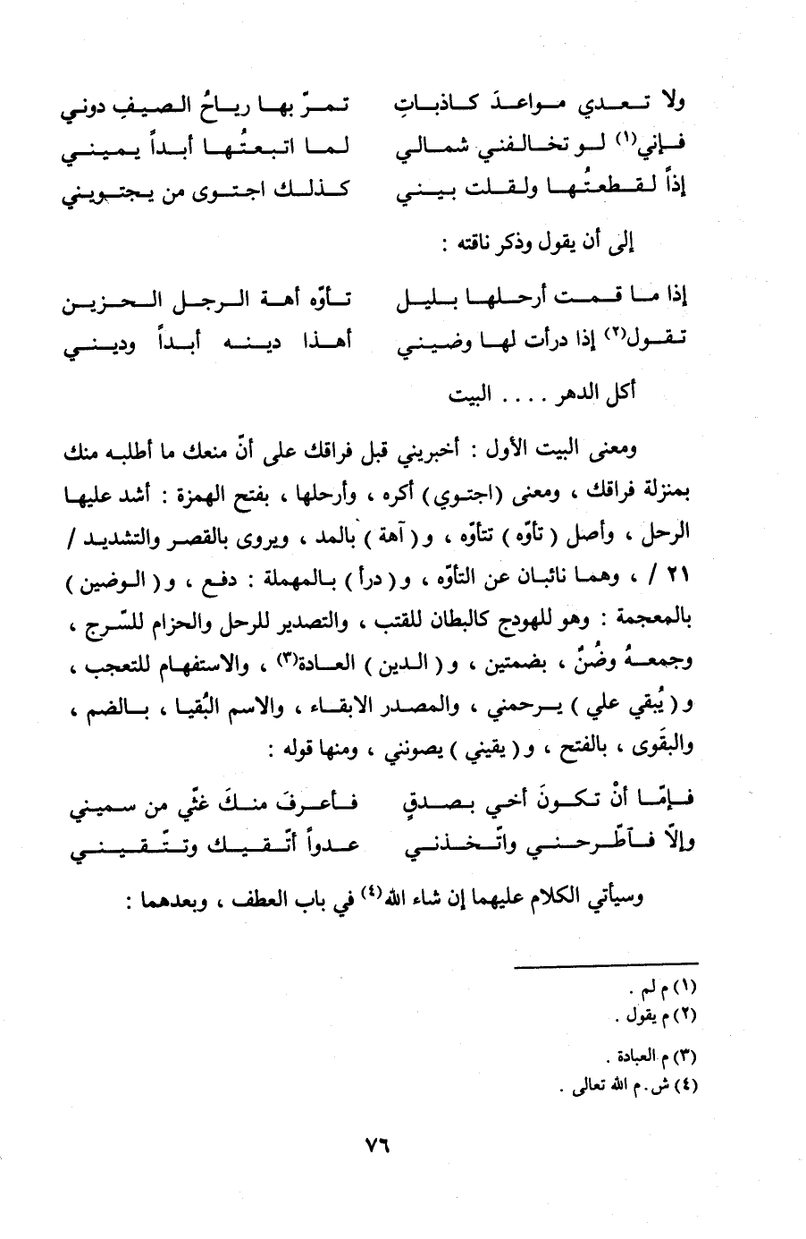 ومعنى البيت الأول: أخبريني قبل فراقك على أن منعك ما أطلبه منك بمنزلة فراقك، ومعنى (اجتوي) أكره، وأرحلها، بفتح الهمزة: أشد عليها الرحل، وأصل (تأوّه) تتأوّه، (آهة) بالمد، ويروى بالقصر والتشديد /21/، وهما نائبان عن التأوّه، و (درأ) بالمهلة: دفع، و (الوضين) بالمعجمة: وهو للهودج كالبطان للقتب، والتصدير للرحل والحزام للسرج، وجمعه وضُنٌ، بضمتين، و (الدين) العادة، والاستفهام للتعجب، و (يُبقي علي) يرحمني، والمصدر الإبقاء، والاسم البُقيا، بالضم، والبَقوى، بالفتح، و (يقيني) يصونني، ومنها قوله: