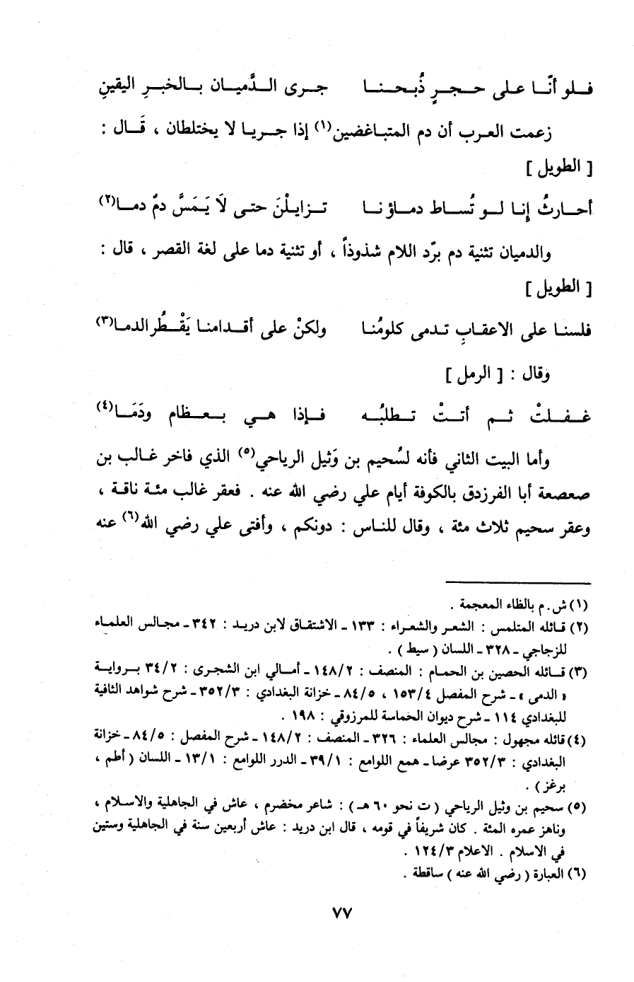 وأما البيت الثاني فإنه لسحيم بن وئيل الرياحي الذي فاخر غالب بن صعصعة أبا الفرزدق بالكوفة أيام علي رضي الله عنه. فعقر غالب مئة ناقة، وعقر سحيم ثلاث مئة، وقال للناس: دونكم، وأفتى علي رضي الله عنه