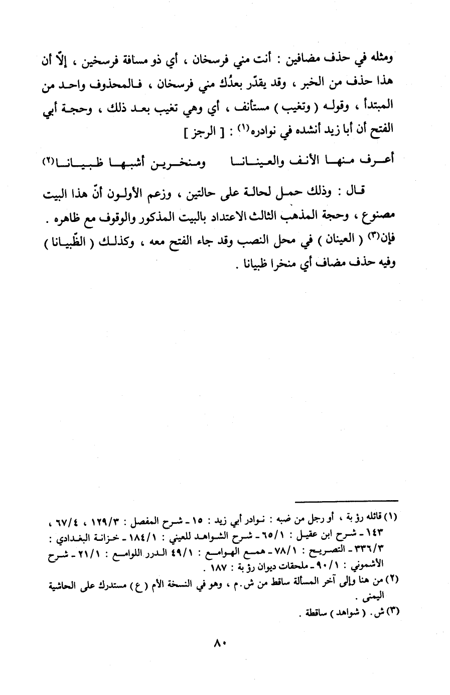 قال: وذلك حمل لحالة على حالتين، وزعم الأولون أن هذا البيت مصنوع، وحجة المذهب الثالث الاعتداد بالبيت المذكور والوقوف مع ظاهره. فإن (العينان) في محل النصب وقد جاء الفتح معه، وكذلك (الظبيانا) وفيه حذف مضاف أي منخرا ظبيانا.