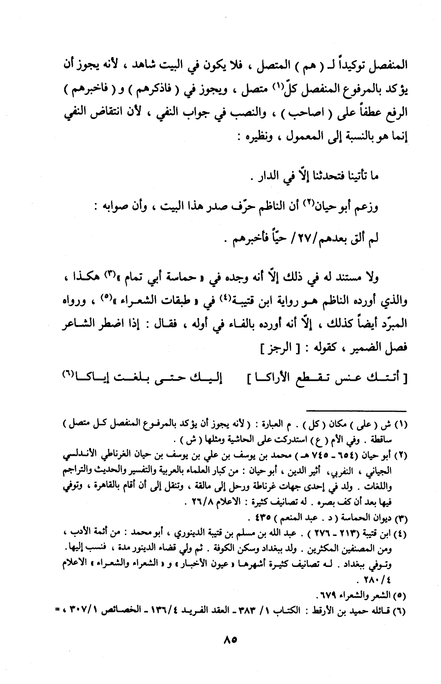 المنفصل توكيداً لـ (هم) المتصل، فلا يكون في البيت شاهد لأنه يجوز أن يؤكد بالمرفوع المنفصل كل متصل، ويجوز في (فاذكرهم) و (فاخبرهم) الرفع عطاً على (اصاحب)، والنصب في جواب النفي؛ لأن انتقاض النفي إنما هو بالنسبة إلى لمعمول، ونظيره: