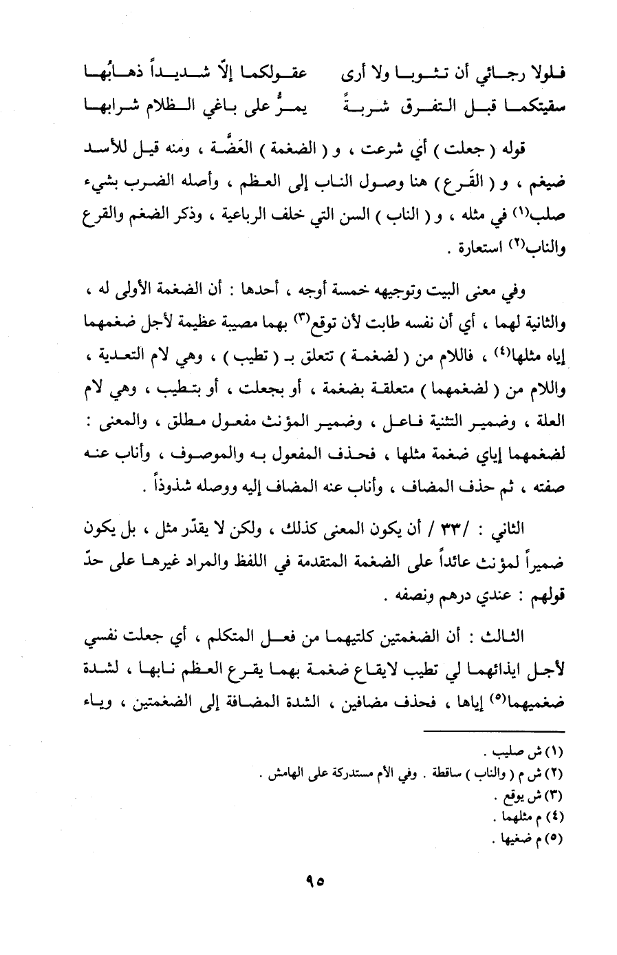 وفي معنى البيت وتوجيهه خمسة أوجه، أحدها: أن الضغمة الأولى له، والثانية لهما، أي أن نفسه طابت لأن توقع بهما مصيبة عظيمة لأجل ضغمهما إياه مثلها، فاللام من (لضغمة) تتعلق ب (تطيب)، وهي لام التعدية، واللام من (لضغمهما) متعلقة بضغمة، أو بجعلت، أو بتطيب، وهي لام العلة، وضمير التثنية فاعل، وضمير المؤنث مفعول مطلق، والمعنى: لضغمهما إياي ضغمة مثلها، فحذف المفعول به والموصوف، وأناب عنه صفته، ثم حذف المضاف، وأناب عنه المضاف إليه ووصله شذوذًا.