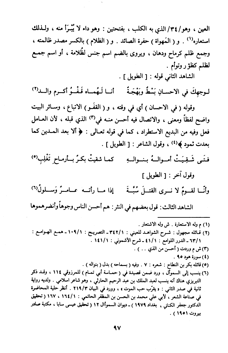 وقوله (في الإحسان) أي في وقته، و (القفو) الاتباع، وسائر البيت واضح لفظًا ومعنى، والاتصال فيه أحسن منه في الذي قبله، لأن العامل فعل وفيه من البديع الاستطراد، كما في قوله تعالى: {أَلَا بُعْدًا لِمَدْيَن كَمَا بَعِدَتْ ثَمُود}، وقول الشاعر: [الطويل].