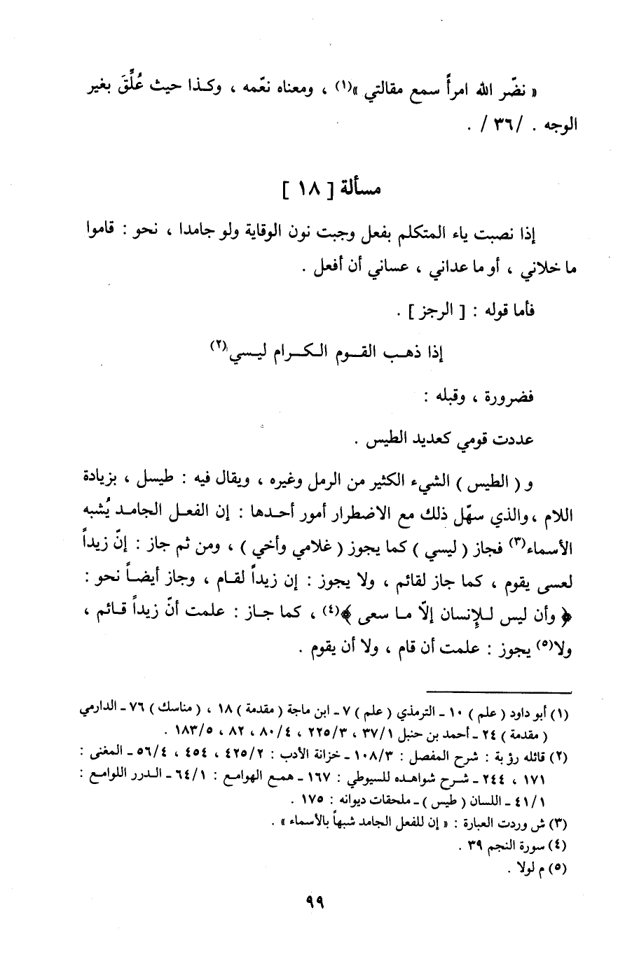 و (الطيس) الشيء الكثير من الرمل وغيره، ويقال فيه: طيسل، بزيادة اللام، والذي سهل ذلك مع الاضطرار أمور أحدها: إن الفعل الجامد يشبه الأسماء فجاز (ليسي) كما يجوز (غلامي وأخي)، ومن ثم جاز: إن زيدًا لعسى يقوم، كما جاز لقائم، ولا يجوز: إن زيدًا لقام، وجاز أيضًا نحو: {وَأَنْ لَيْسَ لِلْإِنْسَانِ إِلَّا مَا سَعَى}، كما جاز: علمت أن زيدًا قائم، ولا يجوز: علمت أن قام، ولا أن يقوم.
