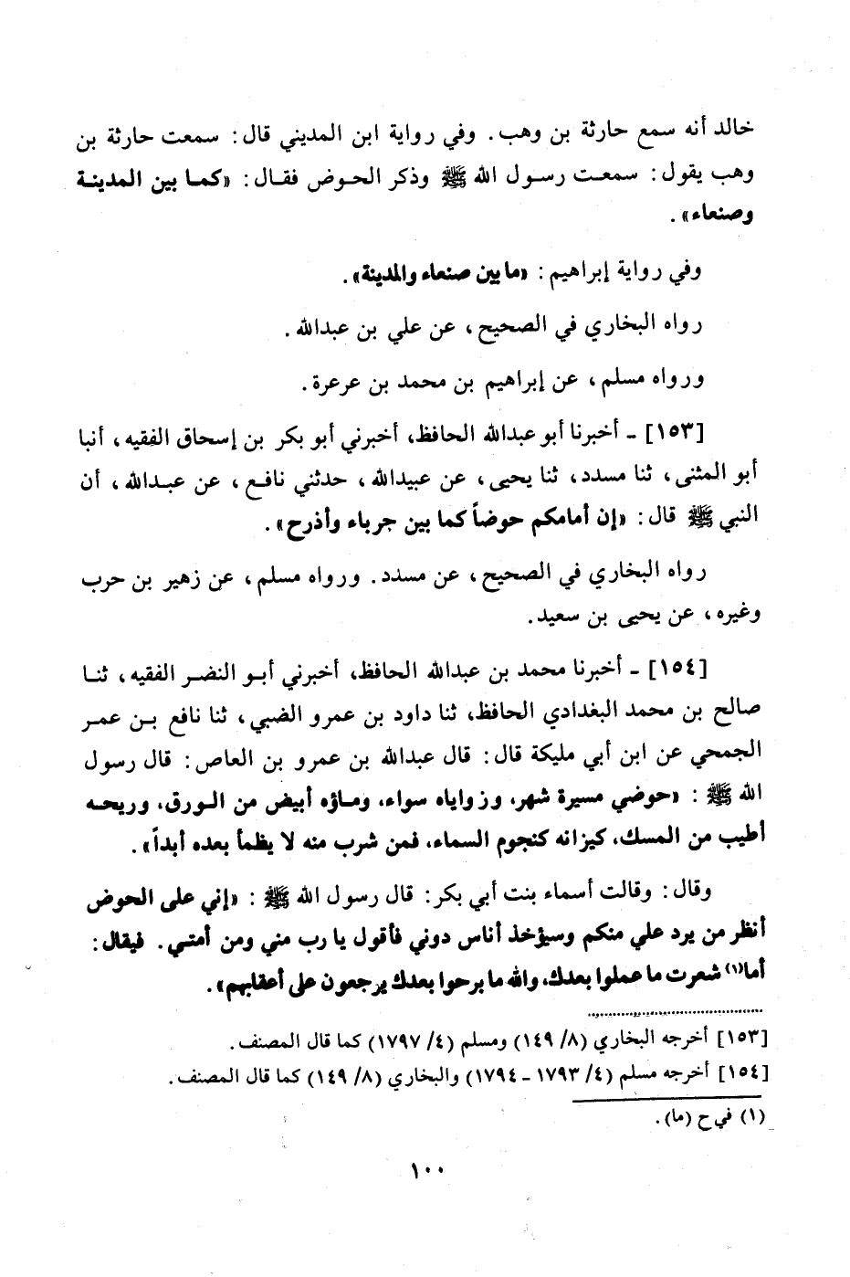 153 - (139) أَخْبَرَنَا أَبُو عَبْدِ اللَّهِ الْحَافِظُ , أَخْبَرَنِي أَبُو بَكْرِ بْنُ إِسْحَاقَ الْفَقِيهُ , أَنْبَأَ أَبُو الْمُثَنَّى , ثنا مُسَدَّدٌ , ثنا يَحْيَى , عَنْ عُبَيْدِ اللَّهِ , حَدَّثَنِي نَافِعٌ , عَنْ عَبْدِ اللَّهِ , أَنَّ النَّبِيَّ صَلَّى اللهُ عَلَيْهِ وَسَلَّمَ قَالَ: «إِنَّ أَمَامَكُمْ حَوْضًا كَمَا بَيْنَ جَرْبَاءَ , وَأَذْرُحَ»
