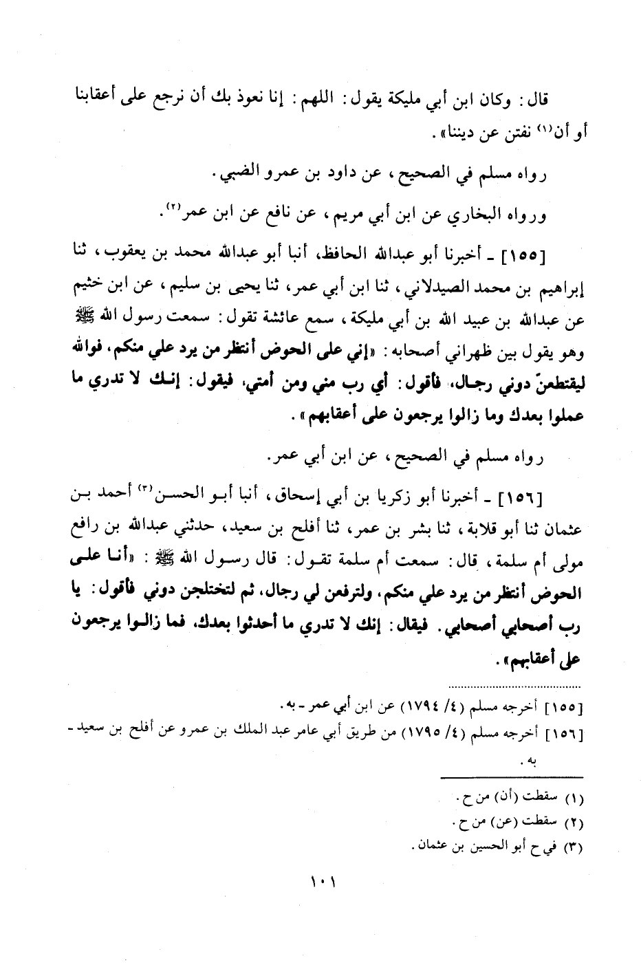 156 - (142) أَخْبَرَنَا أَبُو زَكَرِيَّا بْنُ أَبِي إِسْحَاقَ , أَنْبَأَ أَبُو الْحسَنِ أحمد بْنُ عُثْمَانَ (1) , ثنا أَبُو قِلَابَةَ , ثنا بِشْرُ بْنُ عُمَرَ , ثنا أَفْلَحُ بْنُ سَعِيدٍ , حَدَّثَنِي عَبْدُ اللَّهِ بْنُ رَافِعٍ , مَوْلَى أُمِّ سَلَمَةَ , قَالَ: سَمِعْتُ أُمَّ سَلَمَةَ , تَقُولُ: قَالَ رَسُولُ اللَّهِ صلى الله عليه وسلم أَنَا عَلَى الْحَوْضِ أَنْتَظِرُ مَنْ يَرِدُ عَلَيَّ مِنْكُمْ , وَلَتُرْفَعُنَّ لِي رِجَالٌ , ثُمَّ لَتُخْتَلَجَنَّ دُونِي فَأَقُولُ: يَا رَبِّ أَصْحَابِي أَصْحَابِي , فَيُقَالُ: إِنَّكَ لَا تَدْرِي مَا أَحْدَثُوا بَعْدَكَ , فَمَا زَالُوا يَرْجِعُونَ عَلَى أَعْقَابِهِمْ " #102# أَخْرَجَهُ مُسْلِمٌ فِي الصَّحِيحِ ,مِنْ وَجْهٍ آخَرَ , عَنْ أَفْلَحَ
