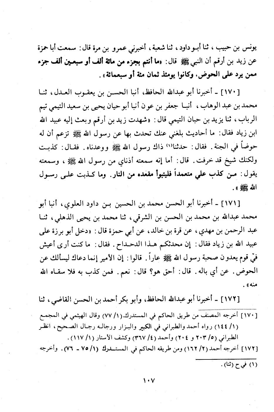 170 - (153) أَخْبَرَنَا أَبُو عَبْدِ اللَّهِ الْحَافِظُ , أَنْبَأَ الْحَسَنُ بْنُ يَعْقُوبَ الْعَدْلُ , ثنا مُحَمَّدُ بْنُ عَبْدِ الْوَهَّابِ , أَنْبَأَ جَعْفَرُ بْنُ عَوْنٍ , أَنْبَأَ أَبُو حَيَّانَ يَحْيَى بْنُ سَعِيدٍ التَّيْمِيُّ تَيْمُ الرَّبَابِ , ثنا يَزِيدُ بْنُ حَبَانَ التَّيْمِيُّ , قَالَ: شَهِدْتُ زَيْدَ بْنَ أَرْقَمَ , وَبَعَثَ إِلَيْهِ عُبَيْدُ اللَّهِ بْنُ زِيَادٍ , فَقَالَ: مَا أَحَادِيثُ بَلَغَنِي عَنْكَ تُحَدِّثُ بِهَا عَنْ رَسُولِ اللَّهِ صَلَّى اللهُ عَلَيْهِ وَسَلَّمَ، تَزْعُمُ أَنَّ لَهُ حَوْضًا فِي الْجَنَّةِ , فَقَالَ: حدثنا ذَاكَ رَسُولُ اللَّهِ صَلَّى اللهُ عَلَيْهِ وَسَلَّمَ وَوَعَدَنَاهُ. فَقَالَ: كَذَبْتَ , وَلَكِنَّكَ شَيْخٌ قَدْ خَرِفْتَ. قَالَ: أَمَا إِنَّهُ سَمِعْتُهُ أُذُنَايَ مِنْ رَسُولِ اللَّهِ صَلَّى اللهُ عَلَيْهِ وَسَلَّمَ , وَسَمِعْتُهُ يَقُولُ: «مَنْ كَذَبَ عَلَيَّ مُتَعَمِّدًا فَلْيَتَبَوَّا مَقْعَدَهُ مِنَ النَّارِ , وَمَا كَذَبْتُ عَلَى رَسُولِ اللَّهِ صَلَّى اللهُ عَلَيْهِ وَسَلَّمَ»