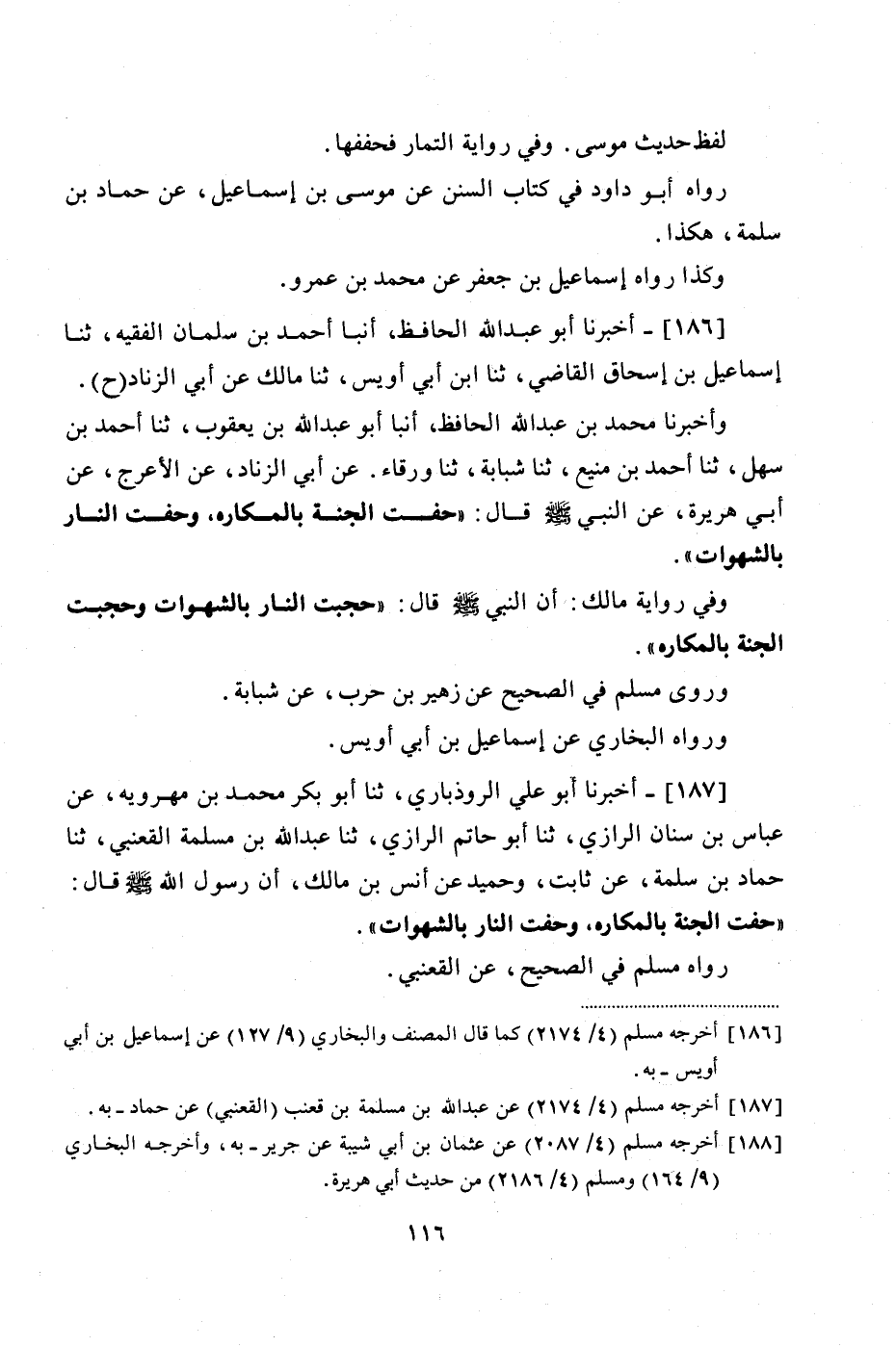 187 - (169) أَخْبَرَنَا أَبُو عَلِيٍّ الرُّوذْبَارِيُّ، ثنا أَبُو بَكْرٍ مُحَمَّدُ بْنُ مَهْرُوَيْهِ، عَنْ عَبَّاسِ بْنِ سِنَانٍ الرَّازِيِّ، ثنا أَبُو حَاتِمٍ الرَّازِيُّ، ثنا عَبْدُ اللَّهِ بْنُ مَسْلَمَةَ الْقَعْنَبِيُّ، ثنا حَمَّادُ بْنُ سَلَمَةَ، عَنْ ثَابِتٍ، وَحُمَيْدٍ، عَنْ أَنَسِ بْنِ مَالِكٍ، أَنَّ رَسُولَ اللَّهِ صَلَّى اللهُ عَلَيْهِ وَسَلَّمَ قَالَ: «حُفَّتِ الْجَنَّةُ بِالْمَكَارِهِ، وَحُفَّتِ النَّارُ بِالشَّهَوَاتِ»