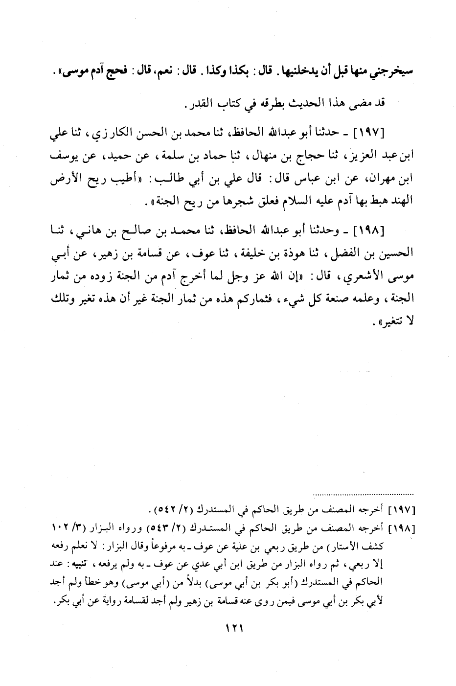 198 - (180) وَحَدَّثنا أَبُو عَبْدِ اللَّهِ الْحَافِظُ، ثنا مُحَمَّدُ بْنُ صَالِحِ بْنِ هَانِي، ثنا الْحُسَيْنُ بْنُ الْفَضْلِ، ثنا هَوْذَةُ بْنُ خَلِيفَةَ، ثنا عَوْفٌ، عَنْ قَسَامَةَ بْنِ زُهَيْرٍ، عَنْ أَبِي مُوسَى الْأَشْعَرِيِّ، قَالَ: «إِنَّ اللَّهَ عَزَّ وَجَلَّ لَمَّا أَخْرَجَ آدَمَ مِنَ الْجَنَّةِ زَوَّدَهُ مِنْ ثِمَارِ الْجَنَّةِ، وَعَلَّمَهُ صَنْعَةَ كُلِّ شَيْءٍ، فَثِمَارُكُمْ هَذِهِ مِنْ ثِمَارِ الْجَنَّةِ، غَيْرَ أَنَّ هَذِهِ تَغَيَّرُ، وَتِلْكَ لَا تَتَغَيَّرُ»