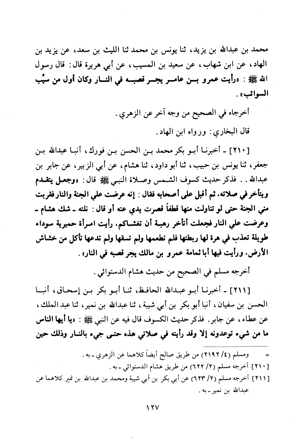 210 - (190) أَخْبَرَنَا أَبُو بَكْرٍ مُحَمَّدُ بْنُ الْحَسَنِ بْنِ فُورَكٍ، أَنْبَأَ عَبْدُ اللَّهِ بْنُ جَعْفَرٍ، ثنا يُونُسُ بْنُ حَبِيبٍ، ثنا أَبُو دَاوُدٍ، ثنا هِشَامٌ، عَنْ أَبِي الزُّبَيْرِ، عَنْ جَابِرِ بْنِ عَبْدِ اللَّهِ،. فَذَكَرَ حَدِيثَ كُسُوفَ الشَّمْسِ، وَصَلَاةَ النَّبِيِّ صَلَّى اللهُ عَلَيْهِ وَسَلَّمَ قَالَ: " وَجَعَلَ يَتَقَدَّمُ، وَيَتَأَخَّرُ فِي صَلَاتِهِ، ثُمَّ أَقْبَلَ عَلَى أَصْحَابِهِ، فَقَالَ: إِنَّهُ عُرِضَتْ عَلَيَّ الْجَنَّةُ، وَالنَّارُ فَقُرِّبَتْ مِنِّي الْجَنَّةُ حَتَّى لَوْ تَنَاوَلْتُ مِنْهَا قِطْفًا قُصِرَتْ يَدَيَّ عَنْهُ، أَوْ قَالَ: نِلْتُهُ - شَكَّ هِشَامٌ -، وَعُرِضَتْ عَلَيَّ النَّارُ فَجَعَلْتُ أَتَأَخَّرُ رَهْبَةً أَنْ تَغْشَاكُمْ، رَأَيْتُ امْرَأَةً حِمْيَرِيَّةً سَوْدَاءَ طَوِيلَةً، تُعَذَّبُ فِي هِرَّةٍ لَهَا رَبَطَتْهَا، فَلَمْ تُطْعِمْهَا، وَلَمْ تَسْقِهَا، وَلَمْ تَدَعْهَا تَاكُلُ مِنْ خَشَاشِ الْأَرْضِ، وَرَأَيْتُ فِيهَا أَبَا ثُمَامَةَ عَمْرَو بْنَ مَالِكٍ، يَجُرُّ قُصْبَهُ فِي النَّارِ "
