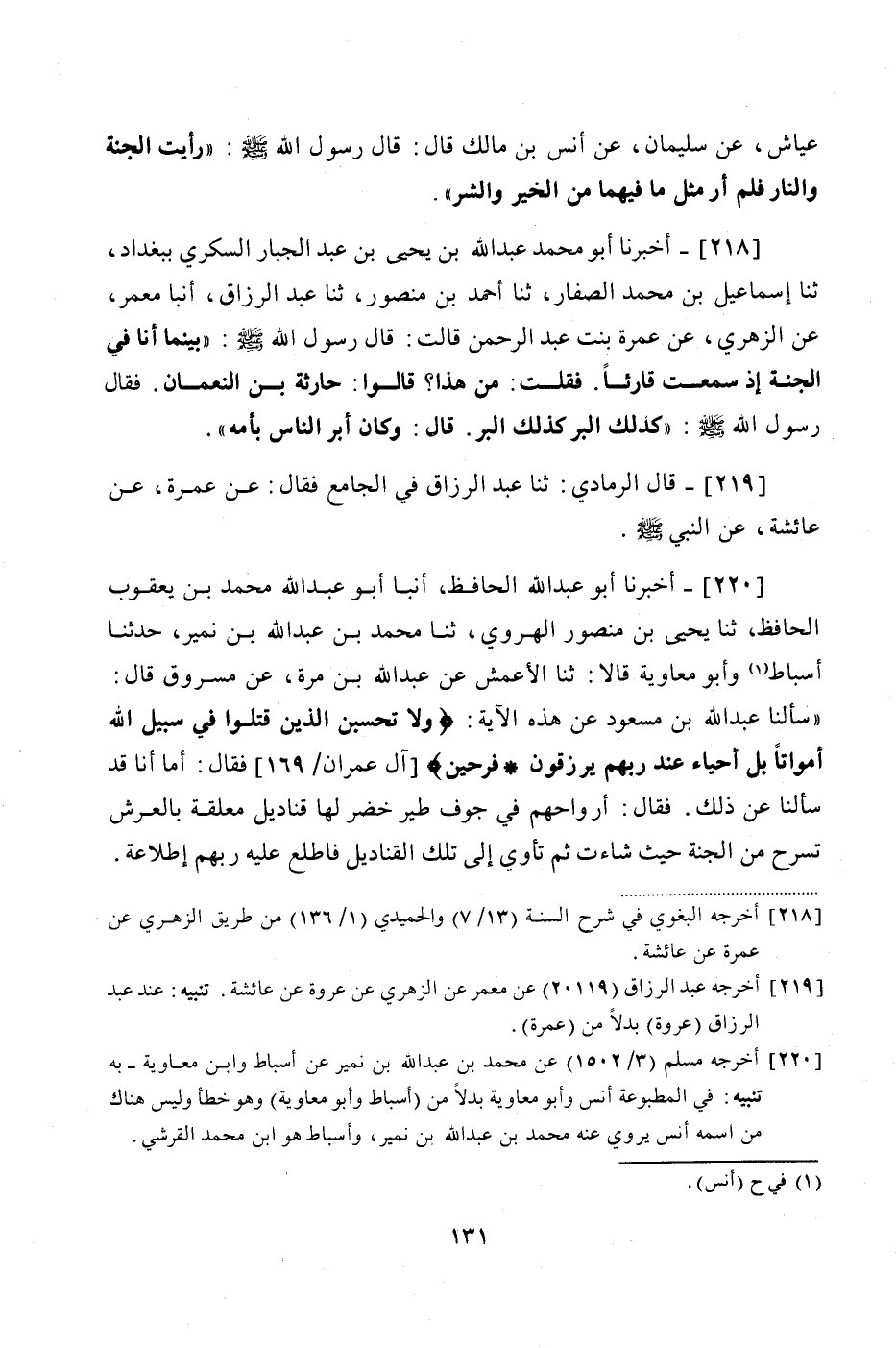 220 - (199) أَخْبَرَنَا أَبُو عَبْدِ اللَّهِ الْحَافِظُ، أَنْبَأَ أَبُو عَبْدِ اللَّهِ مُحَمَّدُ بْنُ يَعْقُوبَ الْحَافِظُ، ثنا يَحْيَى بْنُ مَنْصُورٍ الْهَرَوِيُّ، ثنا مُحَمَّدُ بْنُ عَبْدِ اللَّهِ بْنِ نُمَيْرٍ، حَدَّثَنَا أَسباط، وَأَبُو مُعَاوِيَةَ قَالَا: ثنا الْأَعْمَشُ، عَنْ عَبْدِ اللَّهِ بْنِ مُرَّةَ، عَنْ مَسْرُوقٍ، قَالَ: " سَأَلْنَا عَبْدَ اللَّهِ بْنَ مَسْعُودٍ، عَنْ هَذِهِ الْآيَةِ، {وَلَا تَحْسَبَنَّ الَّذِينَ قُتِلُوا فِي سَبِيلِ اللَّهِ أَمْوَاتًا، بَلْ أَحْيَاءٌ عِنْدَ رَبِّهِمْ يُرْزَقُونَ، فَرِحِينَ} " فَقَالَ: أَمَا أنا قَدْ سَأَلْنَا عَنْ ذَلِكَ، فَقَالَ: أَرْوَاحُهُمْ فِي جَوْفِ طَيْرٍ خُضْرٍ لَهَا قَنَادِيلُ مُعَلَّقَةٌ بِالْعَرْشِ تَسْرَحُ مِنَ الْجَنَّةِ حَيْثُ شَاءَتْ، ثُمَّ تَاوِي إِلَى تِلْكَ الْقَنَادِيلِ، فَاطَّلَعَ عَلَيْهِ رَبُّهُمُ اطِّلَاعَةً