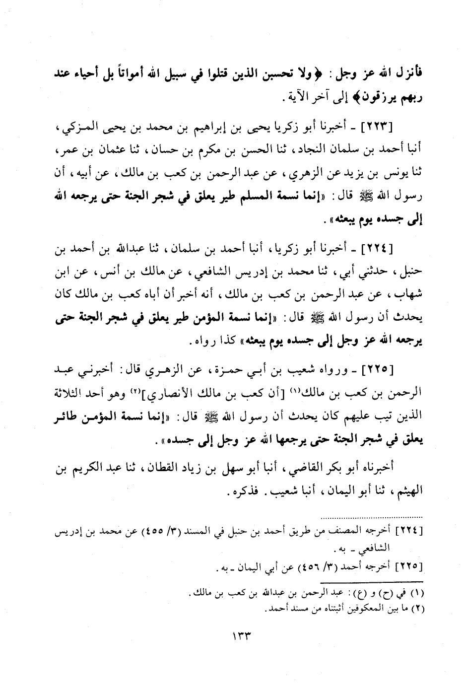 224 - (203) أَخْبَرَنَا أَبُو زَكَرِيَّا، أَنْبَأَ أَحْمَدُ بْنُ سَلْمَانَ، ثنا عَبْدُ اللَّهِ بْنُ أَحْمَدَ بْنِ حَنْبَلٍ، حَدَّثَنِي أَبِي، ثنا مُحَمَّدُ بْنُ إِدْرِيسَ الشَّافِعِيُّ، عَنْ مَالِكِ بْنِ أَنَسٍ، عَنِ ابْنِ شِهَابٍ، عَنْ عَبْدِ الرَّحْمَنِ بْنِ كَعْبِ بْنِ مَالِكٍ، أَنَّهُ أَخْبَرَ أَنَّ أَبَاهُ كَعْبَ بْنَ مَالِكٍ، كَانَ يُحَدِّثُ أَنَّ رَسُولَ اللَّهِ صَلَّى اللهُ عَلَيْهِ وَسَلَّمَ قَالَ: «إِنَّمَا نَسَمَةُ الْمُؤْمِنِ طَيْرٌ يَعْلَقُ فِي شَجَرِ الْجَنَّةِ، حَتَّى يُرْجِعَهُ اللَّهُ عَزَّ وَجَلَّ إِلَى جَسَدِهِ يَوْمَ يَبْعَثُهُ» كَذَا رَوَاهُ