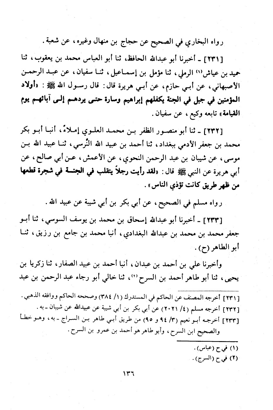 231 - (210) أَخْبَرَنَا أَبُو عَبْدِ اللَّهِ الْحَافِظُ، ثنا أَبُو الْعَبَّاسِ مُحَمَّدُ بْنُ يَعْقُوبَ، ثنا حُمَيْدُ بْنُ عياش الرَّمْلِيُّ، ثنا مُؤَمَّلُ بْنُ إِسْمَاعِيلَ، ثنا سُفْيَانُ، عَنْ عَبْدِ الرَّحْمَنِ الْأَصْبَهَانِيِّ، عَنْ أَبِي حَازِمٍ، عَنْ أَبِي هُرَيْرَةَ، قَالَ: قَالَ رَسُولُ اللَّهِ صَلَّى اللهُ عَلَيْهِ وَسَلَّمَ: «أَوْلَادُ الْمُؤْمِنِينَ فِي جَبَلٍ فِي الْجَنَّةِ يَكْفُلُهُمْ إِبْرَاهِيمُ وَسَارَةُ، حَتَّى يَرُدَّهُمْ إِلَى آبَائِهِمْ يَوْمَ الْقِيَامَةِ»