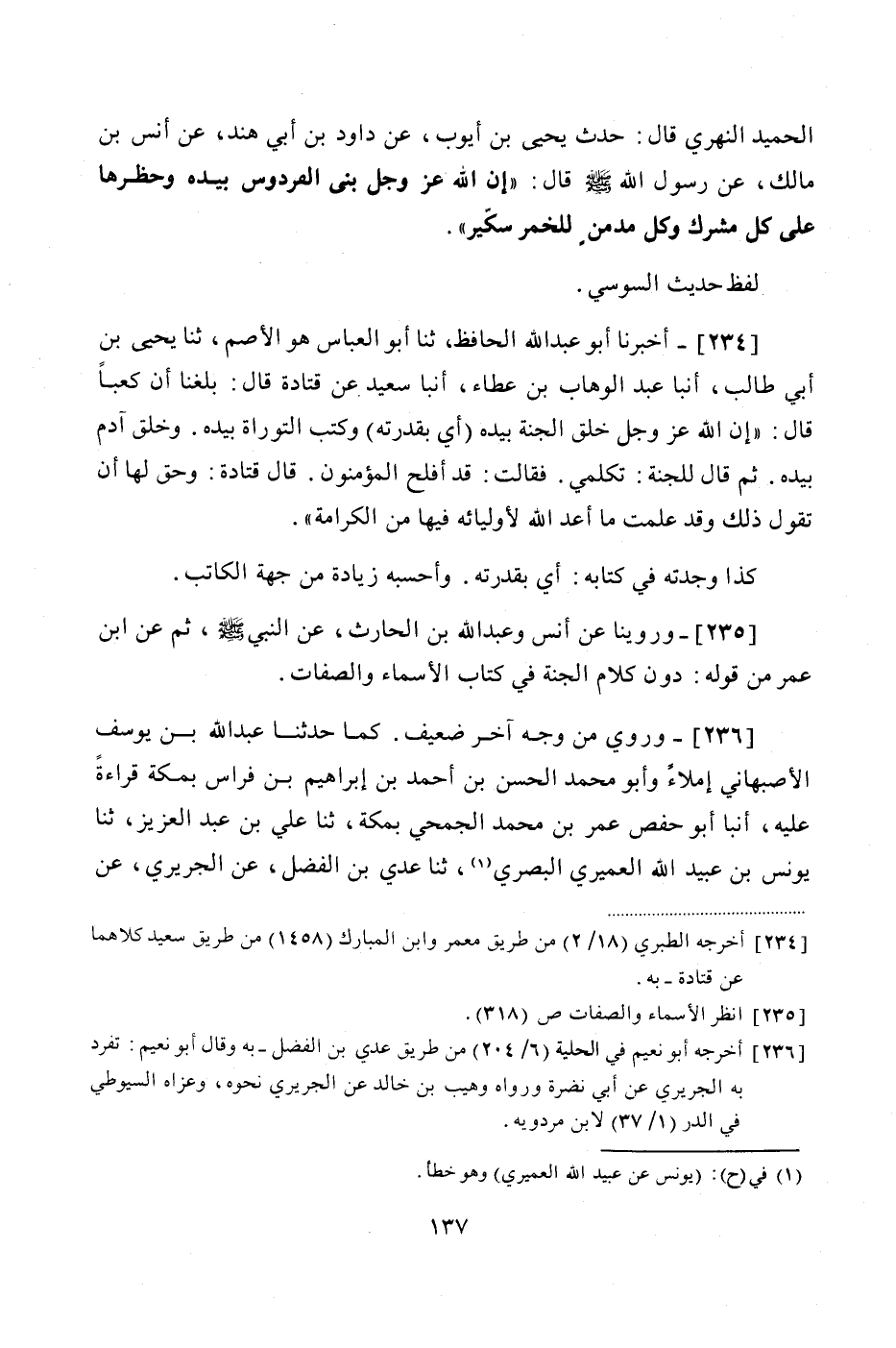 235 - وَرُوِّينَا عَنْ أَنَسٍ، وَعَبْدِ اللَّهِ بْنِ الْحَارِثِ، عَنِ النَّبِيِّ صَلَّى اللهُ عَلَيْهِ وَسَلَّمَ، ثُمَّ عَنِ ابْنِ عُمَرَ مِنْ قَوْلِهِ: دُونَ كَلَامِ الْجَنَّةِ فِي كِتَابِ الْأَسْمَاءِ وَالصِّفَاتِ