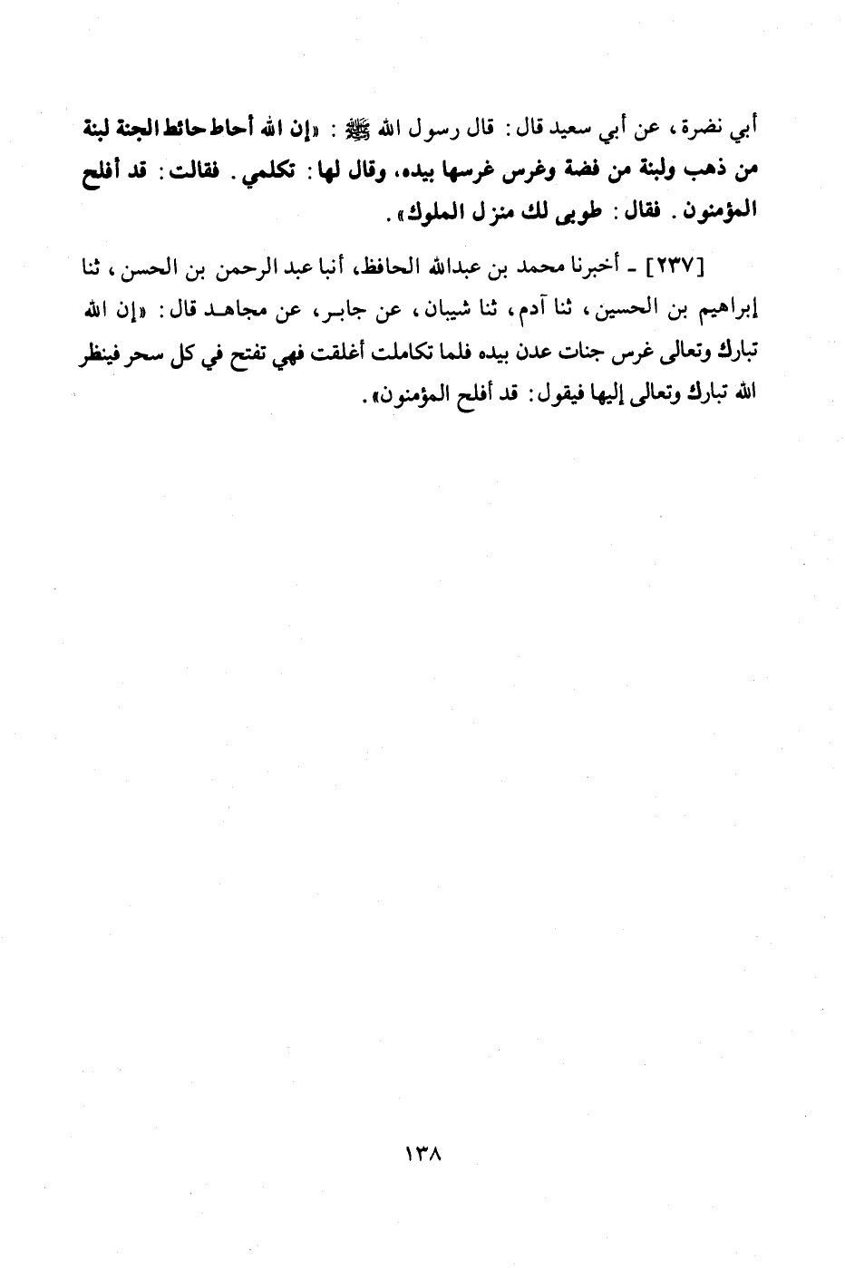 237 - (215) أَخْبَرَنَا مُحَمَّدُ بْنُ عَبْدِ اللَّهِ الْحَافِظُ، أَنْبَأَ عَبْدُ الرَّحْمَنِ بْنُ الْحَسَنِ، ثنا إِبْرَاهِيمُ بْنُ الْحُسَيْنِ، ثنا آدَمُ، ثنا شَيْبَانُ، عَنْ جَابِرٍ، عَنْ مُجَاهِدٍ، قَالَ: " إِنَّ اللَّهَ تَبَارَكَ وَتَعَالَى غَرَسَ جَنَّاتِ عَدْنٍ، بِيَدِهِ فَلَمَّا تَكَامَلَتْ أُغْلِقَتْ فَهِيَ تُفْتَحُ فِي كُلِّ سَحَرٍ، فَيَنْظُرُ اللَّهُ تَبَارَكَ وَتَعَالَى إِلَيْهَا، فَيَقُولُ: {قَدْ أَفْلَحَ الْمُؤْمِنُونَ}