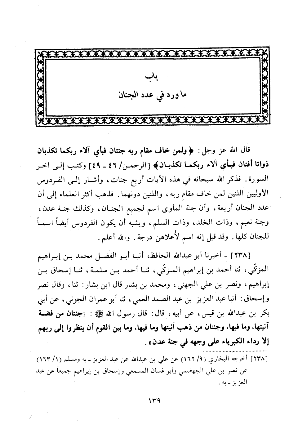 238 - (216) أَخْبَرَنَا أَبُو عَبْدِ اللَّهِ الْحَافِظُ، أَنْبَأَ أَبُو الْفَضْلِ مُحَمَّدُ بْنُ إِبْرَاهِيمَ الْمُزَكِّي، ثنا أَحْمَدُ بْنُ إِبْرَاهِيمَ الْمُزَكِّي، ثنا أَحْمَدُ بْنُ سَلَمَةَ، ثنا إِسْحَاقُ بْنُ إِبْرَاهِيمَ، وَنَصْرُ بْنُ عَلِيٍّ الْجُهَنِيُّ، وَمُحَمَّدُ بْنُ بَشَّارٍ، قَالَ ابْنُ بَشَّارٍ: ثنا وَقَالَ نَصْرٌ، وَإِسْحَاقُ: أَنْبَأَ عَبْدُ الْعَزِيزِ بْنُ عَبْدِ الصَّمَدِ الْعَمِّيُّ، ثنا أَبُو عِمْرَانَ الْجَوْنِيُّ، عَنْ أَبِي بَكْرِ بْنِ عَبْدِ اللَّهِ بْنِ قَيْسٍ، عَنْ أَبِيهِ، قَالَ: قَالَ رَسُولُ اللَّهِ صَلَّى اللهُ عَلَيْهِ وَسَلَّمَ: «جَنَّتَانِ مِنْ فِضَّةٍ آنِيَتُهَا، وَمَا فِيهَا، وَجَنَّتَانِ مِنْ ذَهَبٍ آنِيَتُهَا وَمَا فِيهَا، وَمَا بَيْنَ الْقَوْمِ، أَنْ يَنْظُرُوا إِلَى رَبِّهِمْ إِلَّا رِدَاءَ الْكِبْرِيَاءِ عَلَى وَجْهِهِ فِي جَنَّةِ عَدْنٍ»