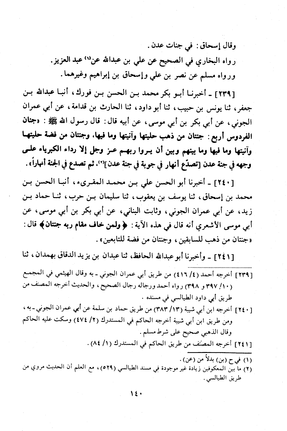 239 - (217) أَخْبَرَنَا أَبُو بَكْرٍ مُحَمَّدُ بْنُ الْحَسَنِ بْنِ فُورَكٍ، أَنْبَأَ عَبْدُ اللَّهِ بْنُ جَعْفَرٍ، ثنا يُونُسُ بْنُ حَبِيبٍ، ثنا أَبُو دَاوُدَ، ثنا الْحَارِثُ بن قُدَامَةَ، عَنْ أَبِي عِمْرَانَ الْجَوْنِيِّ، عَنْ أَبِي بَكْرِ بْنِ أَبِي مُوسَى، عَنْ أَبِيهِ، قَالَ: قَالَ رَسُولُ اللَّهِ صَلَّى اللهُ عَلَيْهِ وَسَلَّمَ: " جِنَانُ الْفِرْدَوْسِ أَرْبَعٌ: جَنَّتَانِ مِنْ ذَهَبٍ حِلْيَتُهَا وَآنِيَتُهَا وَمَا فِيهَا وَجَنَّتَانِ مِنْ فِضَّةٍ حِلْيَتُهَا وَآنِيَتُهَا، وَمَا فِيهَا وَمَا بَيْنَهُمْ، وَبَيْنَ أَنْ يَرَوْا رَبَّهُمْ عَزَّ وَجَلَّ، إِلَّا رِدَاءَ الْكِبْرِيَاءِ عَلَى وَجْهِهِ فِي جَنَّةِ عَدْنٍ تَصَدَّعُ أَنْهَارٌ فِي جَوْبَةٍ فِي جَنَّةِ عَدْنٍ، ثُمَّ تَصَدَّعُ فِي الْجَنَّةِ أَنْهَارًا "
