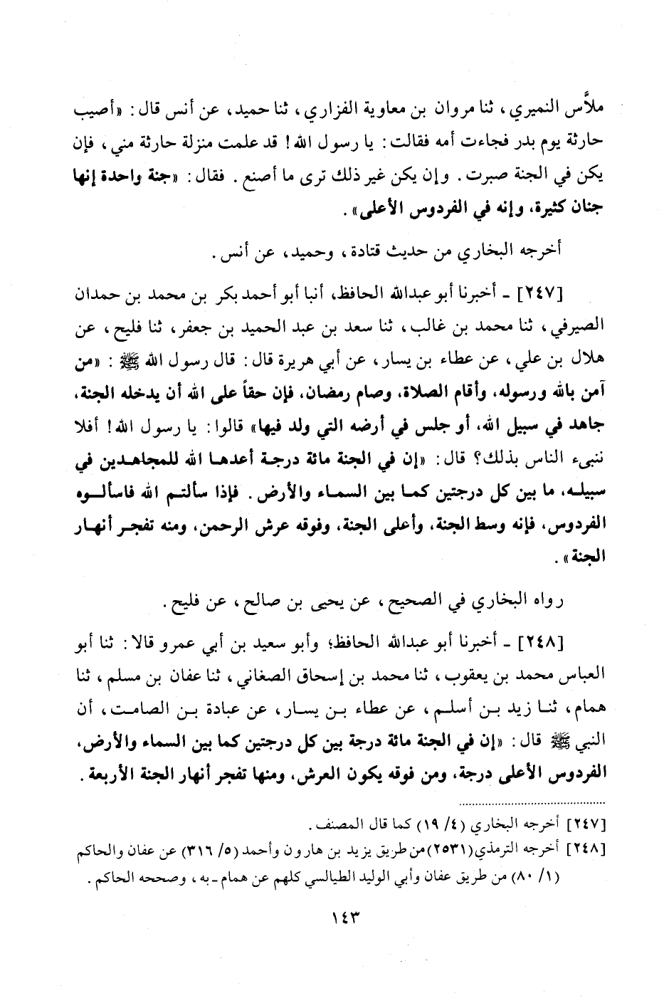 248 - (226) أَخْبَرَنَا أَبُو عَبْدِ اللَّهِ الْحَافِظُ، وَأَبُو سَعِيدِ بْنُ أَبِي عَمْرٍو قَالَا: ثنا أَبُو الْعَبَّاسِ مُحَمَّدُ بْنُ يَعْقُوبَ، ثنا مُحَمَّدُ بْنُ إِسْحَاقَ الصَّغَانِيُّ، ثنا عَفَّانُ بْنُ مُسْلِمٍ، ثنا هَمَّامٌ، ثنا زَيْدُ بْنُ أَسْلَمَ، عَنْ عَطَاءِ بْنِ يَسَارٍ، عَنْ عُبَادَةَ بْنِ الصَّامِتِ، أَنَّ النَّبِيَّ صَلَّى اللهُ عَلَيْهِ وَسَلَّمَ قَالَ: «إِنَّ فِي الْجَنَّةِ مِائَةَ دَرَجَةٍ بَيْنَ كُلِّ دَرَجَتَيْنِ كَمَا بَيْنَ السَّمَاءِ وَالْأَرْضِ، الْفِرْدَوْسُ الْأَعْلَى دَرَجَةٌ، وَمِنْ فَوْقِهِ يَكُونُ الْعَرْشُ، وَمِنْهَا تَفَجَّرُ أَنْهَارُ الْجَنَّةِ الْأَرْبَعَةُ،#144# فَإِذَا سَأَلْتُمُ اللَّهَ عَزَّ وَجَلَّ، فَاسْأَلُوهُ الْفِرْدَوْسَ»