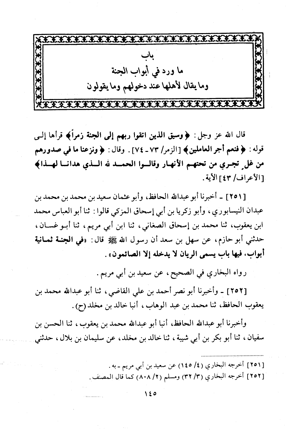 251 - (229) أَخْبَرَنَا أَبُو عَبْدِ اللَّهِ الْحَافِظُ، وَأَبُو عُثْمَانَ سَعِيدُ بْنُ مُحَمَّدِ بْنِ مُحَمَّدِ بْنِ عَبْدَانَ النَّيْسَابُورِيُّ، وَأَبُو زَكَرِيَّا بْنُ أَبِي إِسْحَاقَ الْمُزَكِّي قَالُوا: ثنا أَبُو الْعَبَّاسِ مُحَمَّدُ بْنُ يَعْقُوبَ، ثنا مُحَمَّدُ بْنُ إِسْحَاقَ الصَّغَانِيُّ، ثنا ابْنُ أَبِي مَرْيَمَ، ثنا أَبُو غَسَّانَ، حَدَّثَنِي أَبُو حَازِمٍ، عَنْ سَهْلِ بْنِ سَعْدٍ، أَنَّ رَسُولَ اللَّهِ صَلَّى اللهُ عَلَيْهِ وَسَلَّمَ قَالَ: «فِي الْجَنَّةِ ثَمَانِيَةُ أَبْوَابٍ، فِيهَا بَابٌ يُسَمَّى الرَّيَّانُ لَا يَدْخُلُهُ إِلَّا الصَّائِمُونَ»