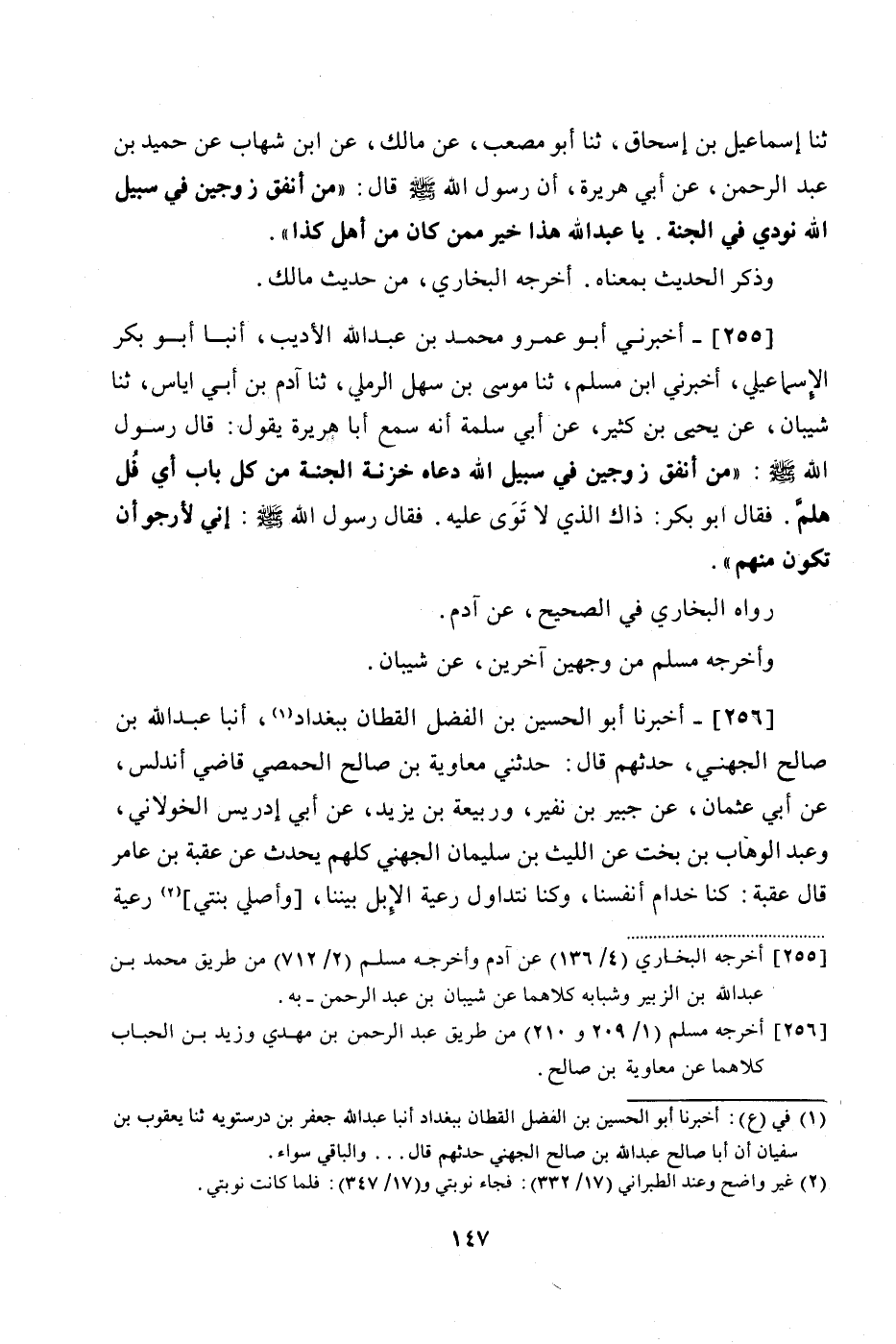 255 - (233) أَخْبَرَنِي أَبُو عَمْرٍو مُحَمَّدُ بْنُ عَبْدِ اللَّهِ الْأَدِيبُ، أَنْبَأَ أَبُو بَكْرٍ الْإِسْمَاعِيلِيُّ، أَخْبَرَنِي ابْنُ مُسْلِمٍ، ثنا مُوسَى بْنُ سَهْلٍ الرَّمْلِيُّ، ثنا آدَمُ بْنُ أَبِي إِيَاسَ، ثنا شَيْبَانُ، عَنْ يَحْيَى بْنِ كَثِيرٍ، عَنْ أَبِي سَلَمَةَ، أَنَّهُ سَمِعَ أَبَا هُرَيْرَةَ، يَقُولُ: قَالَ رَسُولُ اللَّهِ صَلَّى اللهُ عَلَيْهِ وَسَلَّمَ: «مَنْ أَنْفَقَ زَوْجَيْنِ فِي سَبِيلِ اللَّهِ دَعَاهُ خَزَنَةُ الْجَنَّةِ مِنْ كُلِّ بَابٍ أَيْ فُلُ هَلُمَّ»، فَقَالَ أَبُو بَكْرٍ: ذَاكَ الَّذِي لَا تَوَى عَلَيْهِ، فَقَالَ رَسُولُ اللَّهِ صَلَّى اللهُ عَلَيْهِ وَسَلَّمَ: «إِنِّي لَأَرْجُو أَنْ تَكُونَ مِنْهُمْ»